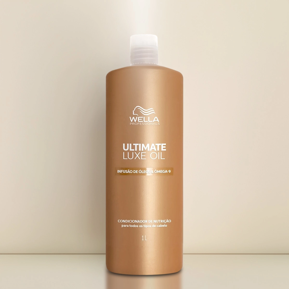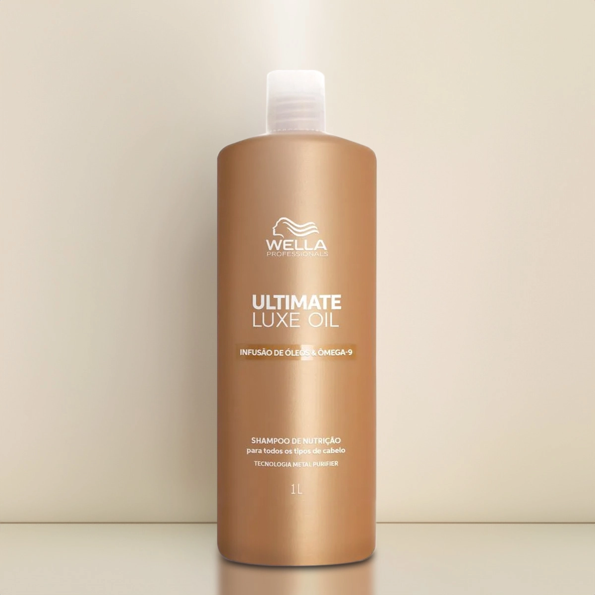 Wella Professionals Ultimate Luxe Oil - Shampoo 1L: para todos os tipos de cabelo, remove o metal e as impurezas acumuladas nos fios. Enriquecido com óleo de argan, amêndoas e jojoba, possui propriedades nutritivas e hidratantes, juntamente com o Ômega-9 para proteção externa dos fios. Pensada para nutrir e proteger os cabelos de dentro para fora.