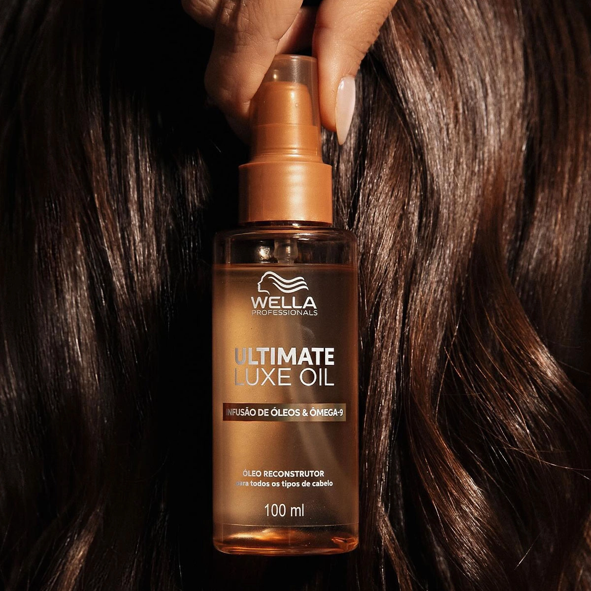 Wella Professionals Ultimate Luxe Oil - Óleo Capilar 100ml: para todos os tipos de cabelo, o óleo capilar não pesa nos fios e oferece uma reconstrução instantânea em apenas 30 segundos, além contar com proteção UV e térmica. Com infusão de óleos nutritivos, como óleo de argan, amêndoas e jojoba. Promove brilho e suavidade incríveis. Conta com ação disciplinante e redutora de frizz.