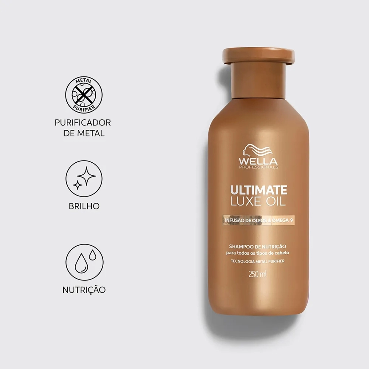 Wella Professionals Ultimate Luxe Oil - Shampoo 250ml: para todos os tipos de cabelo, remove o metal e as impurezas acumuladas nos fios. Enriquecido com óleo de argan, amêndoas e jojoba, possui propriedades nutritivas e hidratantes, juntamente com o ômega-9 para proteção externa dos fios. Pensada para nutrir e proteger os cabelos de dentro para fora.