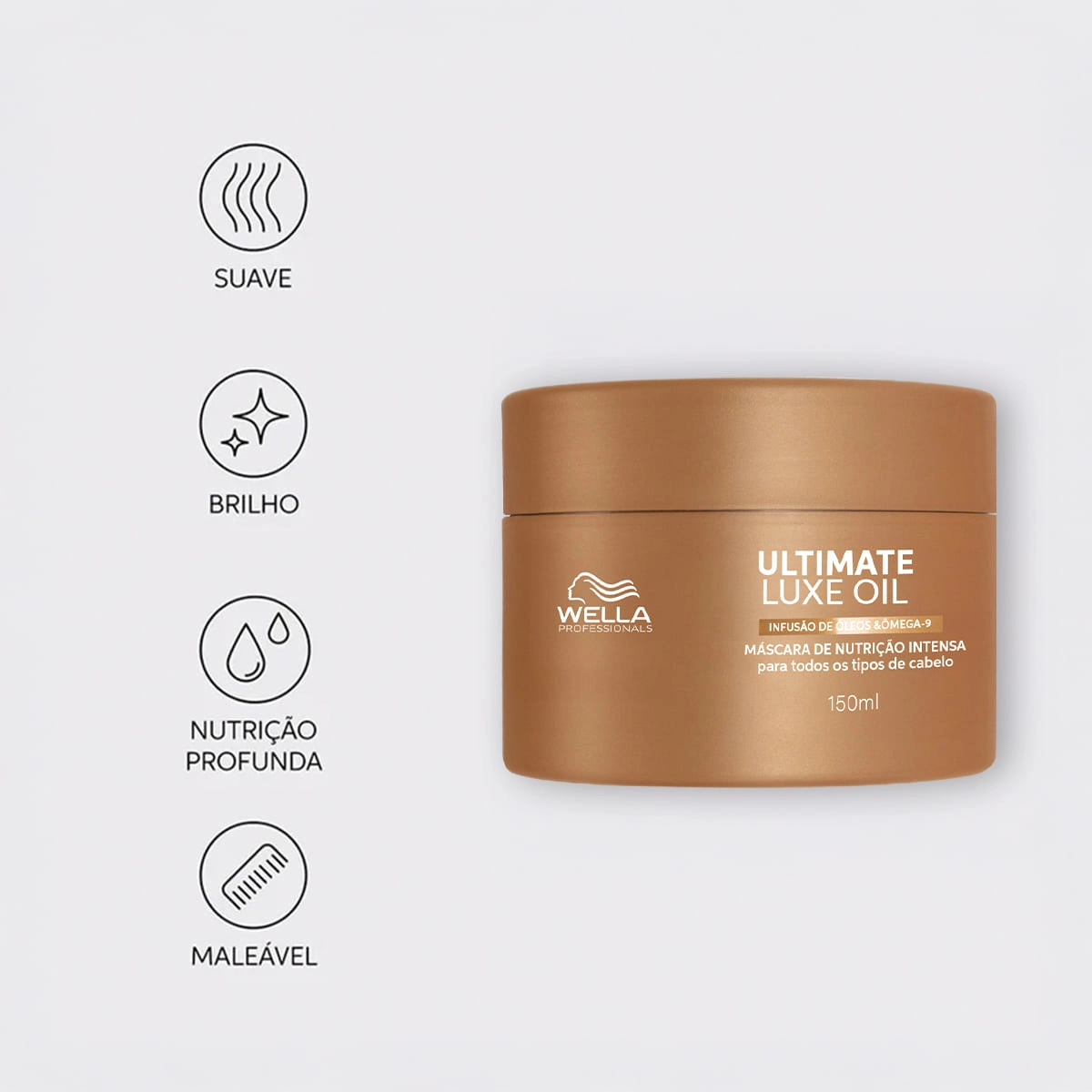 Wella Professionals Ultimate Luxe Oil - Máscara Capilar 150ml: oferece nutrição profunda, brilho e suavidade aos fios. Com óleo de argan, amêndoas, jojoba e ômega-9, promove a saúde dos fios, deixando-os revitalizados e radiantes. Nutre intensamente e reduz instantaneamente o frizz. Ideal para cabelos disciplinados, macios e sedosos a cada uso.