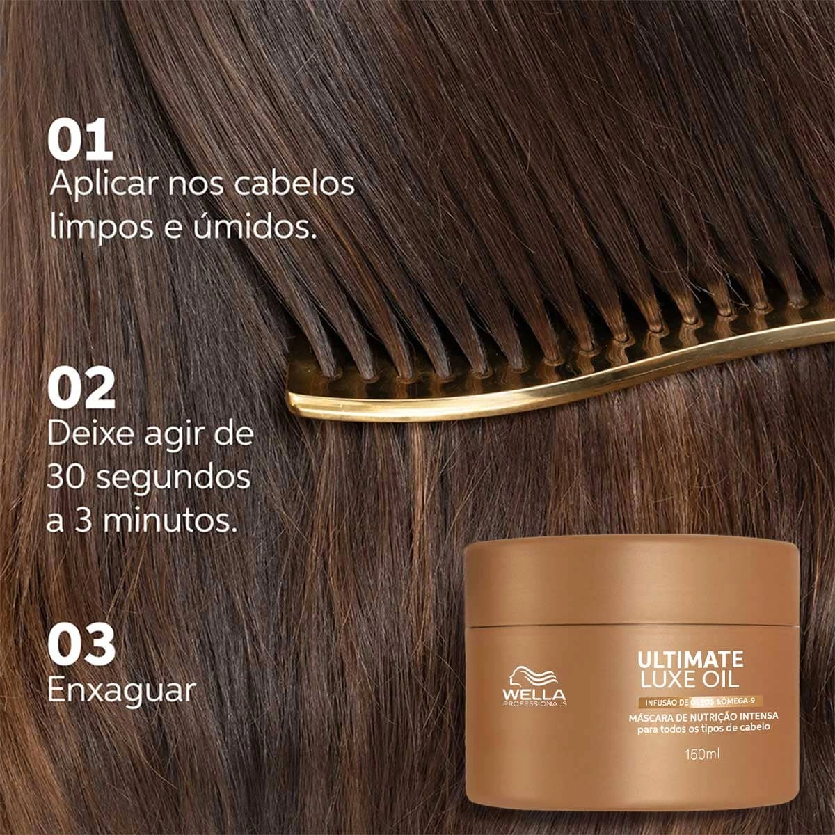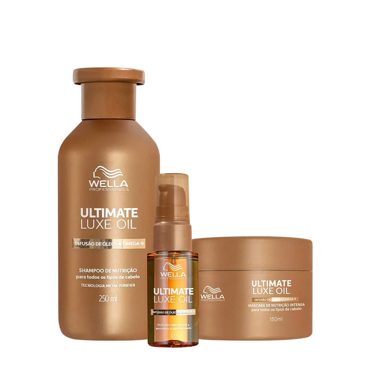 Este Kit Contém Wella Professionals Ultimate Luxe Oil - Shampoo 250ml: remove o metal e as impurezas acumuladas nos fios. Com óleos nobres, possui propriedades nutritivas, hidratantes e proteção externa dos fios. Nutre e protege o cabelo de dentro para fora. Wella Professionals Ultimate Luxe Oil - Máscara Capilar 150ml: oferece nutrição profunda, brilho e suavidade aos fios. Com óleo de argan, amêndoas, jojoba e ômega-9, promove a saúde dos fios, deixando-os revitalizados e radiantes. Nutre intensamente e reduz instantaneamente o frizz. Ideal para cabelos disciplinados, macios e sedosos a cada uso. Wella Professionals Ultimate Luxe Oil - Óleo Capilar 30ml: não pesa nos fios e oferece uma reconstrução instantânea em apenas 30 segundos, com proteção UV e térmica. Com infusão de óleos nutritivos, promove brilho e suavidade incríveis. Conta com ação disciplinante e redutora de frizz. Conselho de AplicaçãoKit Wella Professionals Ultimate Luxe Oil Shampoo Máscara Óleo (3 produtos)