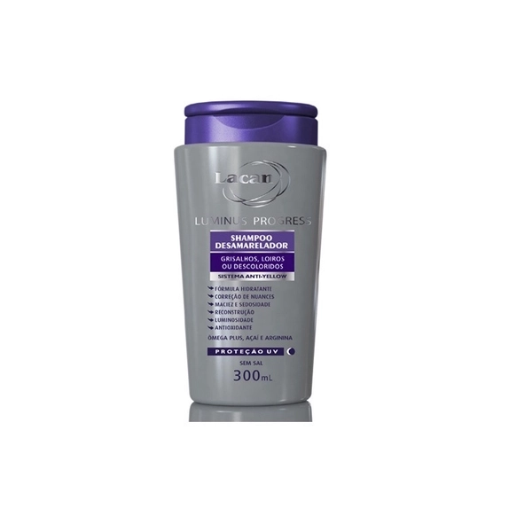 Lacan Luminus Progress Desamarelador Shampoo 300ml Cabelos limpos, lindos e cor luxo com cuidados de tratamento cosmético capilar da Lacan. Higieniza os fios, corrige as nuances, intensifica o loiro e previne o alaranjado. CARACTERÍSTICA/AÇÃO Higienização com ação reconstrutora, hidratante e matizadora. Corrige as nuances, intensifica o tom loiro, fortalece os fios e hidrata. SUGESTÃO DE USO RESULTADO Cabelos loiros e grisalhos sem o indesejável alaranjado. Além de deixar o cabelo mais macio, leve e hidratado.