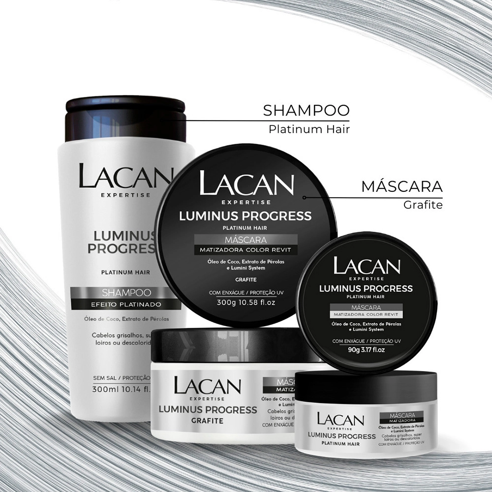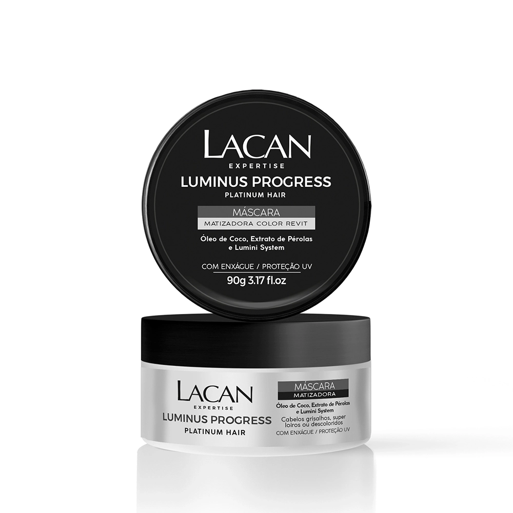 Possui uma combinação de micropigmentos matizadores rigorasamente selecionados, que neutraliza e corrige o indesejável tom amarelado ou alaranjado dos fios loiros, descoloridos, com mechas ou grisalhos, promovendo efeito platinado levemente acinzentado. Com Lumini System, confere brilho extraordinário aos fios. Conselho de AplicaçãoLacan Luminus Progress Platinum Hair - Máscara Matizadora 90g