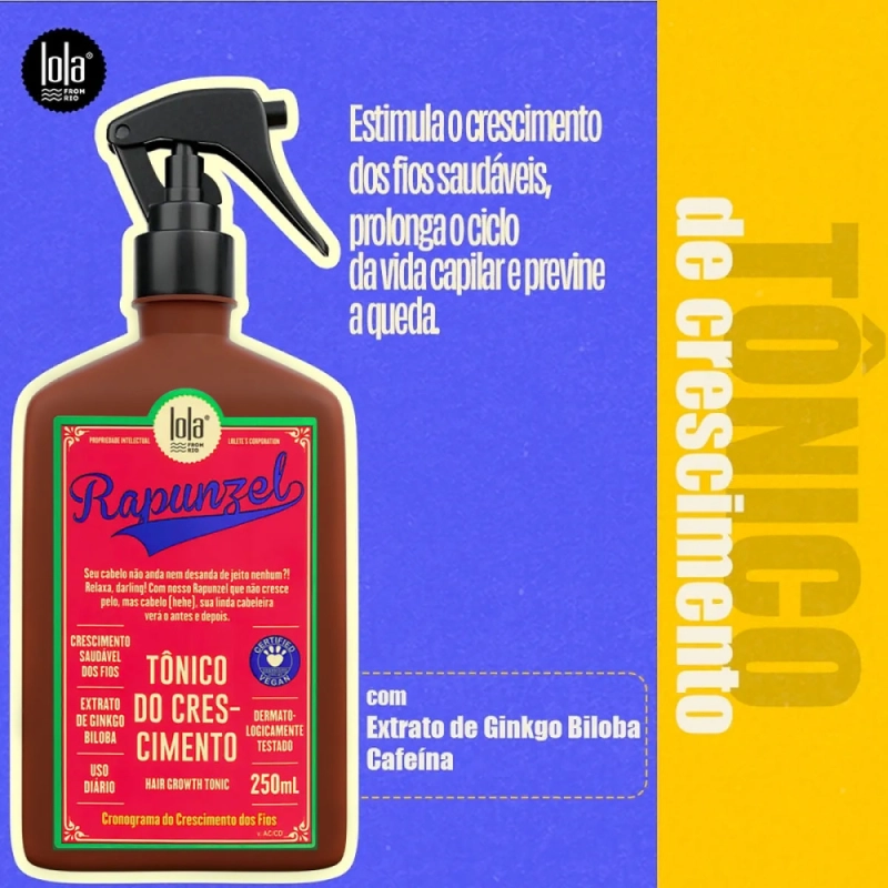 Para cabelos com queda. Lola From Rio Rapunzel é a escolha perfeita para ter aquele cabelão que você tanto sonhou. Reduz a perda dos fios, conferindo saúde e força extra. De uso contínuo, fortalece o folículo capilar, para a raiz ficar mais resistente. Conselho de AplicaçãoLola From Rio Rapunzel - Tônico Capilar 250ml