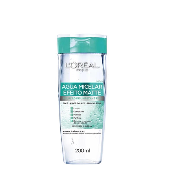 L'Oréal Paris 5 em 1 Efeito Matte Agua Micelar 200ml+BB Cream Clara FPS 50 30g Água Micelar L'Oréal Paris Efeito Matte é a solução perfeita para manter sua pele livre de impurezas e suavizada. Possui fórmula poderosa e não oleosa composta por micelas, que deixam o rosto completamente limpo e com aspecto sequinho. BB Cream L'Oréal Paris 5 em 1 Efeito Matte também protege a pele contra as agressões do sol e conta com fórmula com um blend de Silicas, de poder absorvente, que garante rápida absorção e toque seco. Com cobertura leve, ele não pesa e proporciona uma maquiagem com resultado natural. Contém: 01 L'Oréal Paris Efeito Matte - Água Micelar 200ml: Para todos os tipos de pele. Conta com 5 benefícios em um só produto: limpa, demaquila, purifica, remove o excesso de oleosidade e reequilibra o rosto. 01 L'Oréal Paris 5 em 1 Efeito Matte FPS 50 Clara - BB Cream 30g: BB Cream com textura oil free.Controla o brilho, ajuda a corrigir as imperfeições e uniformiza o rosto. Conselho de Aplicação Aplique a Água Micelar, de manhã e à noite, sobre um disco de algodão na face, olhos e lábios. Não é necessário esfregar ou enxaguar. A água micelar dispensa o uso de demaquilante e tônico, deixando a pele limpa e saudável. Com o auxílio de um pincel ou com as mãos, aplique o BB cream sobre a pele limpa e seca. Caso ache necessário, pode passar uma segunda camada para maior cobertura Além da proteção química do protetor solar, a coloração do BB cream também oferece uma barreira física, ou seja, impede ainda mais que a luz e radiação atinja a pele
