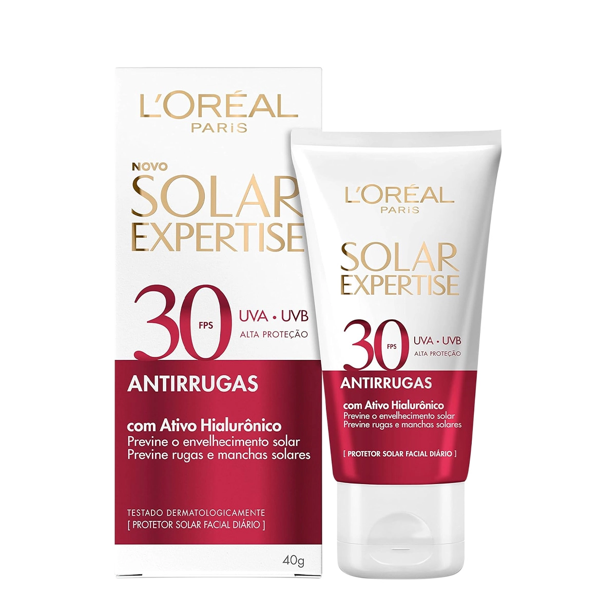 Para todos os tipos de pele. Protetor solar, oferece alta proteção, hidrata, previne rugas e manchas. Formulado com ativo hialurônico, textura de alta absorção, fácil aplicação, oil free e resistente a água. L’Oréal Paris Solar Expertise possui dupla ação antienvelhecimento, conferindo alta proteção contra os raios UVA e UVB, prevenindo o envelhecimento cutâneo. Conselho de AplicaçãoL'Oréal Paris Solar Expertise Antirrugas FPS30 - Protetor Solar Facial 40g