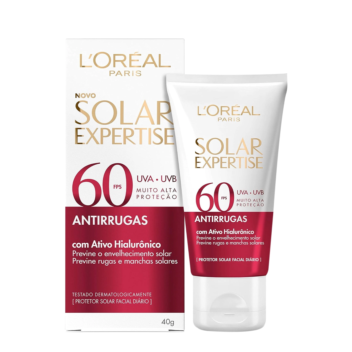 Para todos os tipos de pele. Protetor solar, oferece alta proteção, hidrata, previne rugas e manchas. Formulado com ativo hialurônico, textura de alta absorção, fácil aplicação, oil free e resistente a água. L’Oréal Paris Solar Expertise possui dupla ação antienvelhecimento, conferindo alta proteção contra os raios UVA e UVB, prevenindo o envelhecimento cutâneo. Conselho de AplicaçãoL'Oréal Paris Solar Expertise Antirrugas FPS60 - Protetor Solar Facial 40g