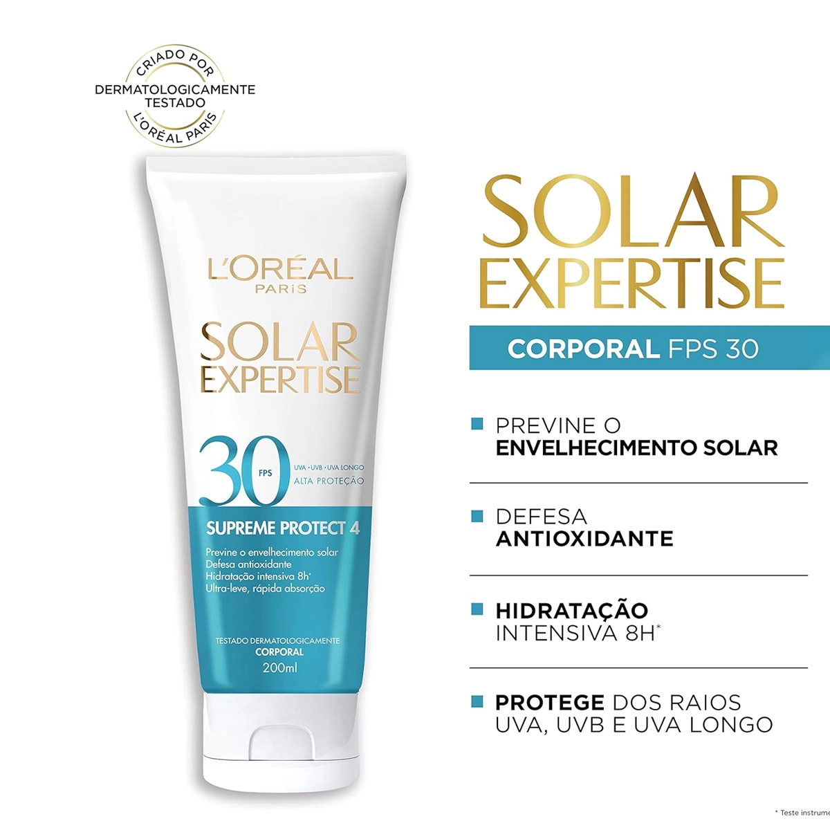 Para todos os tipos de pele. Protetor solar facial e corporal, com proteção avançada e cuidados especiais para a pele. Enriquecido com o complexo Mexoryl X4, proporciona alta defesa antioxidante, preserva o colágeno, hidrata intensivamente e promove uma pele radiante e saudável. De textura leve e rápida absorção, possui resistência à água, toque aveludado e maciez. Previna o envelhecimento precoce e manchas solares com este protetor solar essencial para a sua rotina de cuidados. Conselho de AplicaçãoL'Oréal Paris Solar Expertise Supreme Protect 4 FPS30 - Protetor Solar Corporal 200ml