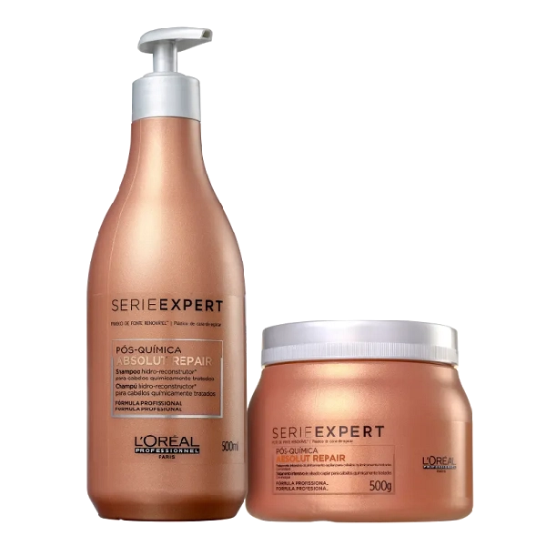 Kit de tratamento para cabelos quimicamente tratados. Kit L'Oréal Professionnel Absolut Repair Pós-Química apresenta alta capacidade nutritiva e reconstrói intensamente a fibra capilar. Desenvolvido especialmente para atender as necessidades dos cabelos das brasileiras, Kit L'Oréal Professionnel Absolut Repair Pós-Química combate as pontas duplas, previne quebras e quedas capilares e oferece hidratação. Contém: - L'Oréal Professionnel Absolut Repair Pós-Química Multi-Reconstrutor - Shampoo 500ml: limpa e tem alto poder de reconstrução. - L'Oréal Professionnel Absolut Repair Pós-Química Multi-Reconstrutor - Máscara Capilar 500g: fortalece, hidrata e resgata a saúde capilar. Intra-Cylane e Ácido Salicílico: adiciona volume fio a fio, da raiz às pontas. Além disso, controla o excesso de oleosidade e mantém o cabelo volumoso e com vida durante o dia todo. Complexo Pro-Spirulin: à base de Spirulina, um ativo natural com alta capacidade nutritiva, ele reconstrói intensamente a fibra capilar. Hydrovance: oferece duas vezes mais nutrição e hidratação aos fios, além de reduzir pontas duplas e tornar os fios mais macios e flexíveis. Com o cabelo molhado, aplique o shampoo e massageie suavemente o couro cabeludo. Em seguida, enxágue. Se desejar, repita o processo. Após isso, passe a máscara capilar, mecha a mecha, e massageie levemente. Deixe por 5 minutos e retire com água. Nossos Experts Ensinam Use uma toalha para tirar o excesso de água dos fios depois da lavagem. Isto garante que o tratamento da máscara conseguirá penetrar corretamente nos fios. L'Oréal Professionnel Absolut Repair Pós-Química Shampoo+Mascara 500ml