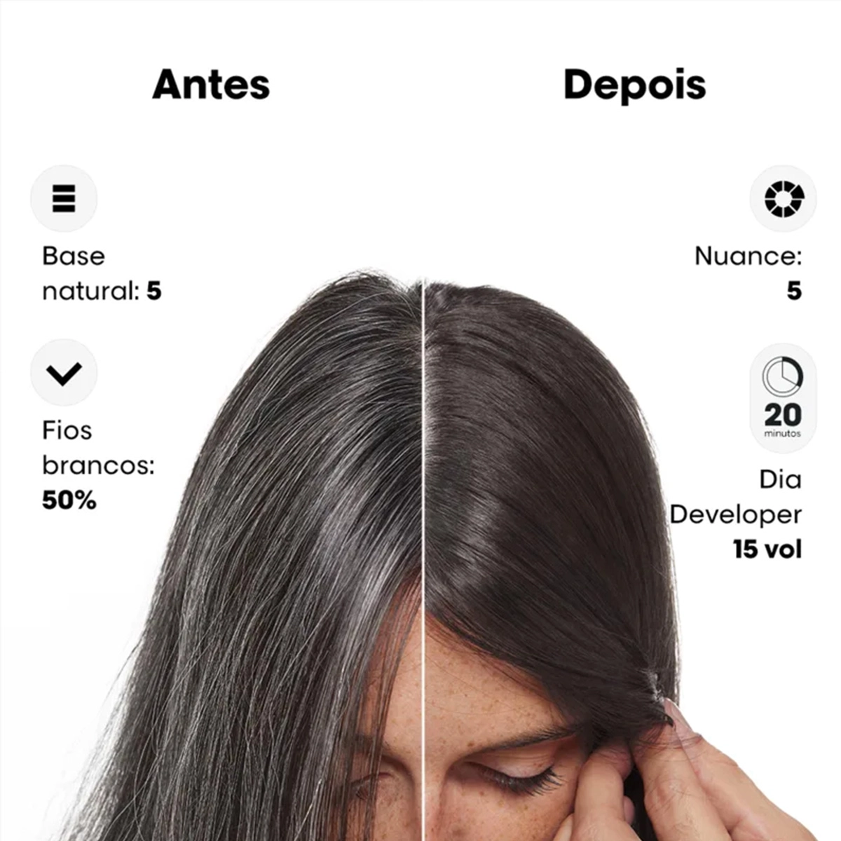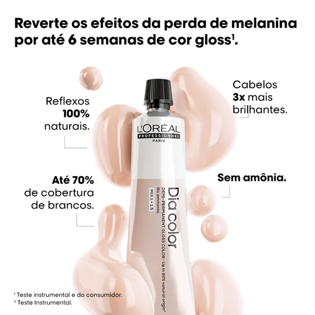 Ideal para quem deseja fios com brilho intenso e cores naturais. Sua fórmula sem amônia, alcalina e demipermanente, nutre os fios, potencializando até 6 semanas de cor e brilho intensos. Com tecnologia de preenchimento de melanina, revitaliza a cor original do cabelo, com efeito sutil e elegante, sem agredir os fios. Conselho de AplicaçãoL'Oréal Professionnel Dia Color 5 Castanho Claro - Tonalizante 60g
