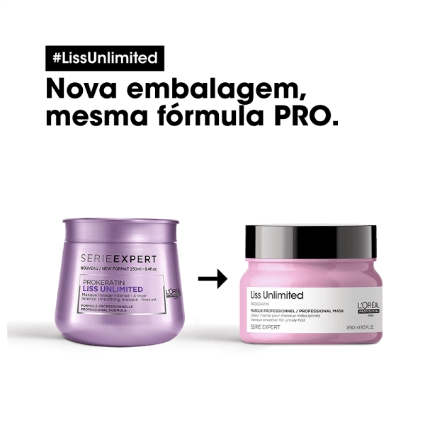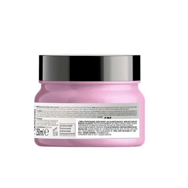 Máscara de tratamento para cabelos rebeldes ou com frizz, em tamanho salão. A fórmula do L'Oréal Professionnel Liss Unlimited Tratamento Intensivo promove hidratação intensa e nutre as fibras capilares. Ela ainda fortalece e ajuda na reparação dos fios. Ação Conselho de Aplicação Aplique sobre o cabelo limpo e úmido. Massageie gentilmente, espalhando bem a Máscara. Deixe agir por 5 minutos e enxágue completamente. Resultado Seu cabelo hidratado, nutrido, fortalecido e com um efeito mais liso.L'Oréal Professionnel Expert Liss Unlimited - Máscara Capilar 250g