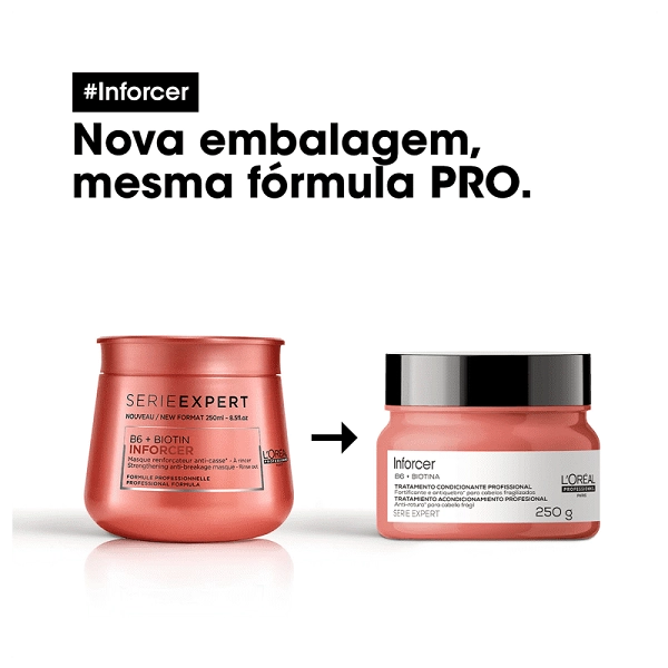 Máscara para cabelos frágeis e quebradiços. L'Oréal Professionnel Inforcer Serie Expert estimula o crescimento dos fios já existentes contra quebra e com resistência. Tratamento nutritivo profundo que funciona como suplemento para o cabelo. L'Oréal Professionnel Inforcer Serie Expert dá força para o crescimento saudável e prevenção a quebra. Um tratamento intenso ideal para quem está querendo deixar os cabelos compridos. Conselho de Aplicação Depois de lavar o cabelo, retire a umidade excessiva dos fios. Então, aplique a máscara pelo comprimento e pontas. Massageie mecha a mecha, deslizando as mãos no sentido do crescimento do cabelo, com o movimento de enluvá-lo. Espalhe bem. Deixe agir no cabelo por 5 minutos. Em seguida, enxágue completamente.