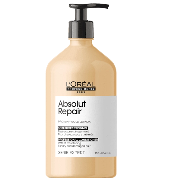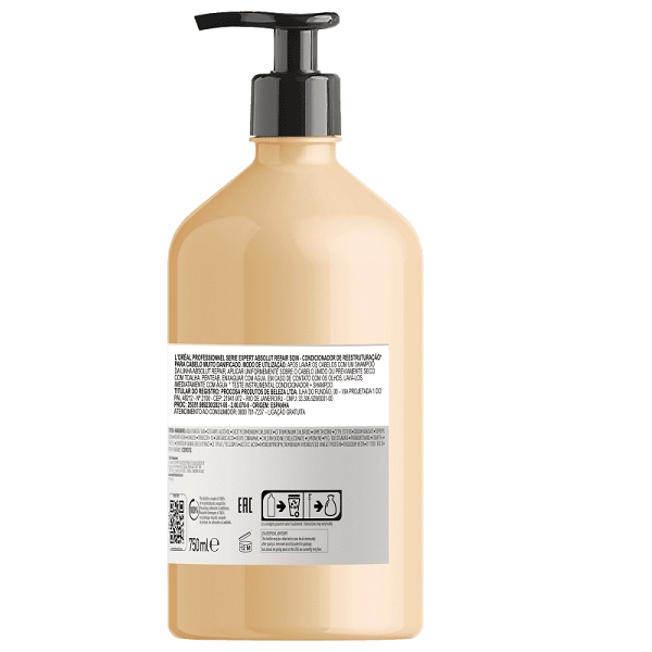 Condicionador para cabelos danificados. L'Oréal Professionnel Serie Expert Absolut Repair Gold Quinoa + Protein Instant Resurfacing Conditioner desembaraça e reestrutura a superfície do fio para mais brilho e leveza. O Condicionador Serie Expert Absolut Repair Gold Quinoa + Protein L'Oréal Professionnel traz ativos que ajudam restaurar a superfície dos fios para que o cabelo revele uma aparência mais saudável. Seu visual ganha muito mais luminosidade e um toque sedoso incrível. Experimente também o Shampoo L'Oréal Professionnel Serie Expert Absolut Repair Gold Quinoa + Protein. Distribua de maneira uniforme por todo o cabelo lavado e seco com uma toalha. Deixe no cabelo de 2 a 3 minutos e depois enxague completamente. Evite exagerar na quantidade do condicionador, já que isso vai dificultar a remoção do produto e causar desperdício. O que vai gerar resultados satisfatórios é o uso adequado dos ativos, não a quantidade em grandes proporções. Conselho de Aplicação