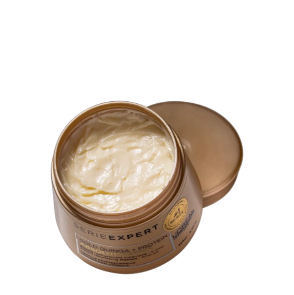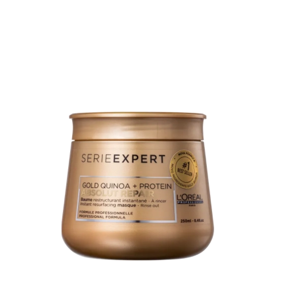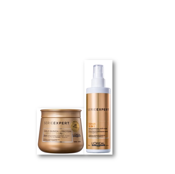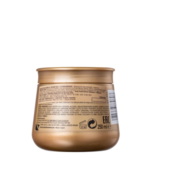 L'Oréal Absolut Repair Gold Quinoa Protein máscara de tratamento para cabelos danificados. L'Oréal Professionnel Serie Expert Absolut Repair Gold Quinoa + Protein Instant Resurfacing Masque faz uma restauração completa nos fios para devolver saúde e brilho ao cabelo. A Máscara Absolut Repair Gold Quinoa + Protein L'Oréal Professionnel atua na reparação da fibra capilar extremamente fragilizada para que o cabelo revele uma aparência mais saudável. Seu visual ganha muito mais brilho e um toque macio incrível. L'Oréal Professionnel Absolut Repair Gold Quinoa + Protein Instant Resurfacing Masque, a máscara de reestruturação intensiva! Leave-in para cabelos danificados. L'Oréal Professionnel Serie Expert Absolut Repair Gold Quinoa + Protein 10 in 1 Perfecting Multipurpose Spray possui propriedades de tratamento, finalização e proteção para trazer mais saúde aos fios, que ganham brilho e toque sedoso. O Leave-in Absolut Repair Gold Quinoa + Protein 10 in 1 L'Oréal Professionnel apresenta 10 benefícios aos fios, além de ser fácil de espalhar com uniformidade sobre o cabelo: - Tratamento: nutrição, recapeamento, redução de pontas duplas, toque sedoso e suavidade; - Finalização: desembaraço, facilidade para secar o cabelo e controle do frizz; - Proteção: anti-poluição e térmica até 230°C/450°F. Espalhe a máscara no cabelo limpo e úmido, nos comprimentos e pontas. Deixe agir por cerca de 5 minutos e enxágue. Borrife o leave-in sobre os fios úmidos. Penteie para espalhar a fórmula e finalize como desejar. L'Oréal Professionnel Serie Expert Absolut Repair Gold Quinoa + Protein Máscara 250g+Leave-in 190ml