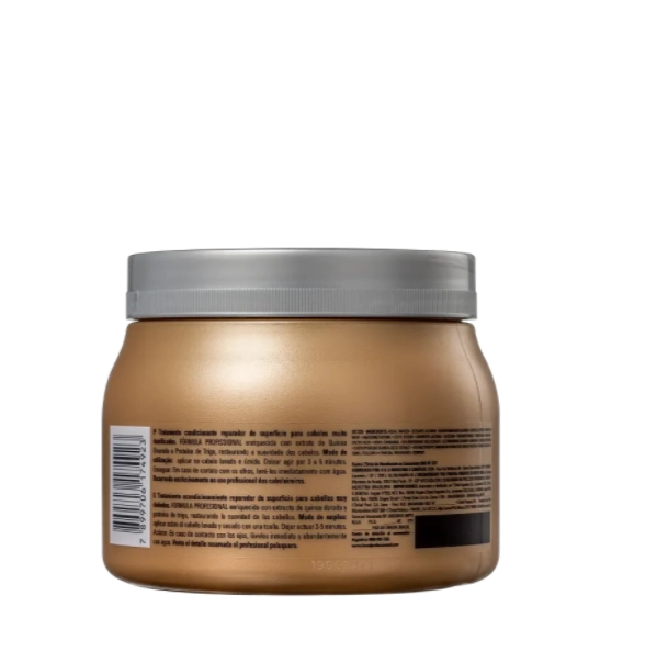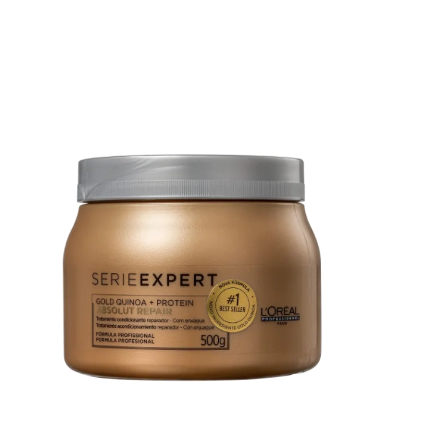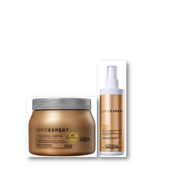 L'Oréal Absolut Repair Gold Quinoa Protein máscara de tratamento para cabelos danificados. L'Oréal Professionnel Serie Expert Absolut Repair Gold Quinoa + Protein Instant Resurfacing Masque faz uma restauração completa nos fios para devolver saúde e brilho ao cabelo. A Máscara Absolut Repair Gold Quinoa + Protein L'Oréal Professionnel atua na reparação da fibra capilar extremamente fragilizada para que o cabelo revele uma aparência mais saudável. Seu visual ganha muito mais brilho e um toque macio incrível. L'Oréal Professionnel Absolut Repair Gold Quinoa + Protein Instant Resurfacing Masque, a máscara de reestruturação intensiva! Leave-in para cabelos danificados. L'Oréal Professionnel Serie Expert Absolut Repair Gold Quinoa + Protein 10 in 1 Perfecting Multipurpose Spray possui propriedades de tratamento, finalização e proteção para trazer mais saúde aos fios, que ganham brilho e toque sedoso. O Leave-in Absolut Repair Gold Quinoa + Protein 10 in 1 L'Oréal Professionnel apresenta 10 benefícios aos fios, além de ser fácil de espalhar com uniformidade sobre o cabelo: - Tratamento: nutrição, recapeamento, redução de pontas duplas, toque sedoso e suavidade; - Finalização: desembaraço, facilidade para secar o cabelo e controle do frizz; - Proteção: anti-poluição e térmica até 230°C/450°F. Espalhe a máscara no cabelo limpo e úmido, nos comprimentos e pontas. Deixe agir por cerca de 5 minutos e enxágue. Borrife o leave-in sobre os fios úmidos. Penteie para espalhar a fórmula e finalize como desejar. L'Oréal Professionnel Serie Expert Absolut Repair Gold Quinoa + Protein Máscara 500g+Leave-in 190ml