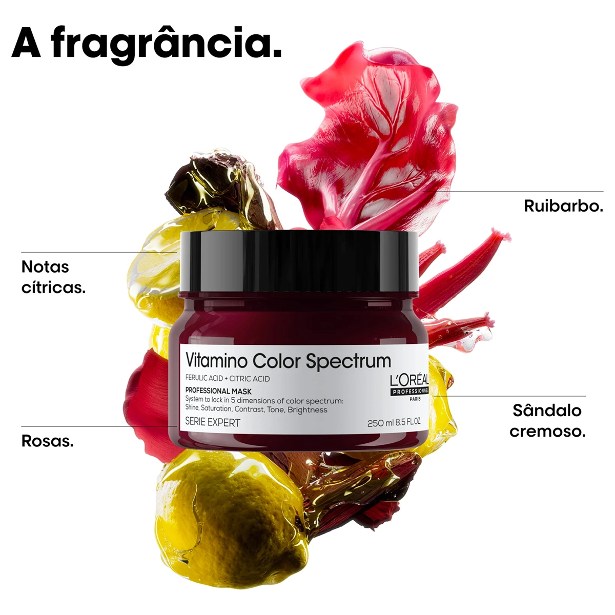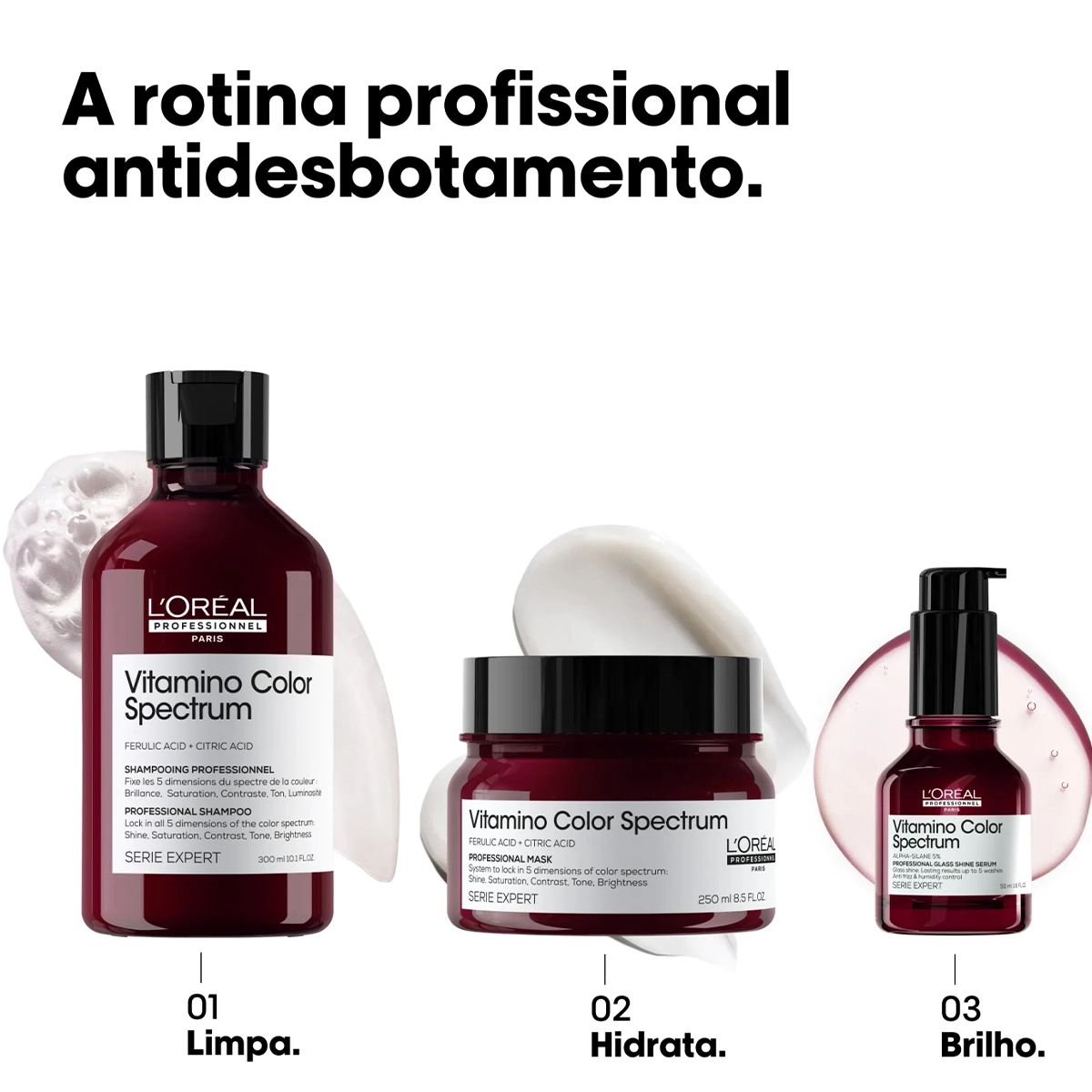 Para cabelos coloridos ou com mechas. Hidrata intensamente, reforça a fibra capilar e mantém a cor vibrante e radiante por até 100 dias. Enriquecida com ácido ferúlico e ácido cítrico, sua fórmula avançada protege os pigmentos, sela os fios e revela até 5 dimensões da cor: brilho, saturação, contraste, tom e luminosidade. Conselho de AplicaçãoL'Oréal Professionnel Vitamino Color Spectrum - Cor Viva, Brilho Espelhado e Nutrição Profunda
