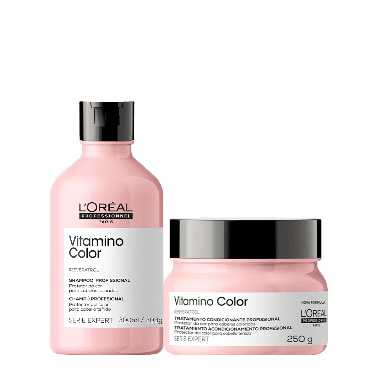 Kit de tratamento para cabelos coloridos ou com mechas. L’Oréal Professionnel Expert Vitamino Color Resveratrol promove a proteção até das cores mais sensíveis, com hidratação e luminosidade para os fios. Este Kit Contém L'Oreal Serie Expert Vitamino Color - Shampoo 300ml: realiza uma limpeza delicada que não agride e mantém o brilho da cor. Conta com fórmula antioxidante que evita os danos do dia a dia e o desbotamento. L'Oreal Serie Expert Vitamino Color - Máscara Capilar 250g: proporciona hidratação, proteção da cor e devolve a maciez e brilho intenso aos fios.L'Oreal Serie Expert Vitamino Color Kit Shampoo e Máscara