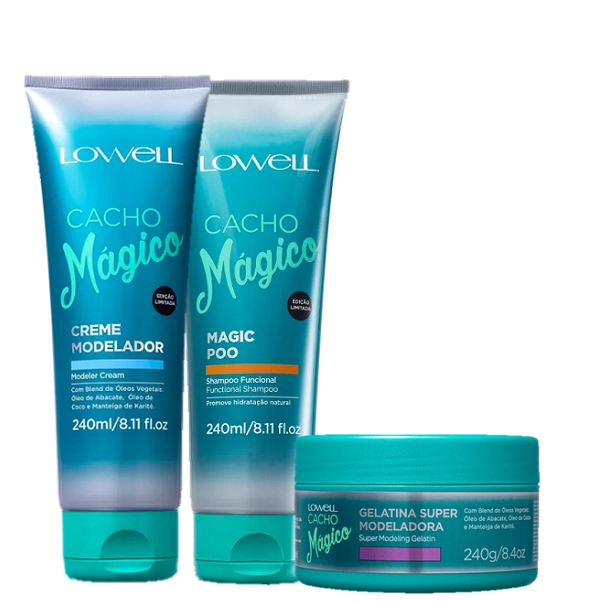 Lowell Cacho Mágico Creme Modelador de Cachos Lowell Cacho Mágico possui ativos que mantém a saúde dos fios para proporcionar cabelos resistentes, disciplinados, com brilho e definição. Além disso, conta com proteção térmica para o uso de difusor sem medo. Dê a finalização necessária para conquistar cachos incríveis! Conselho de Aplicação Para maior definição, misture com a Gelatina Modeladora Lowell Cacho Mágico. Para maior fixação, borrife o Fluído Ativador de Cachos Lowell Cacho Mágico. Lowell Cacho Mágico Magic Poo Lowell Cacho Mágico Magic Poo Shampoo possui fórmula suave, que higieniza os fios sem ressecar ou deixar com aspecto oleoso. Com ele, você tem o cuidado que seu cabelo realmente merece: delicado e hidratante ao mesmo tempo. Conselho de Aplicação Lowell Cacho Mágico Super Modeladora Lowell Cacho Mágico Gelatina Super Modeladora atribui forma ao cabelo enquanto protege contra a umidade do ar e aumenta o brilho e a maciez. Possui proteção térmica para você usar o difusor sem medo. Assim, oferece uma finalização versátil e maleável que vai deixar seus cachos incríveis por mais tempo. Conselho de Aplicação Caso deseje dar mais volume ainda para os fios, separe o cabelo em mechas e seque com o secador e difusor.Lowell Cacho Magico Shampoo 240ml Creme Modelador 240ml e Gelatina 240ml