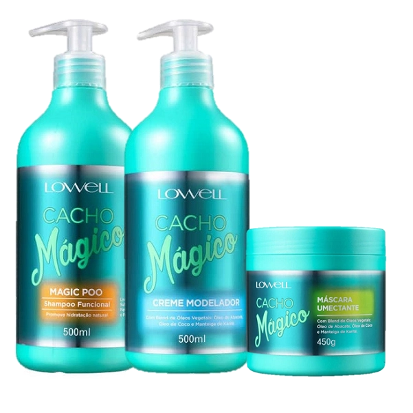 Descrição Cacho Mágico Lowell Cacho Mágico Magic Poo Lowell Cacho Mágico Magic Poo Shampoo possui fórmula suave, que higieniza os fios sem ressecar ou deixar com aspecto oleoso. Com ele, você tem o cuidado que seu cabelo realmente merece: delicado e hidratante ao mesmo tempo. Conselho de Aplicação Lowell Cacho Mágico Creme Modelador de Cachos Lowell Cacho Mágico possui ativos que mantém a saúde dos fios para proporcionar cabelos resistentes, disciplinados, com brilho e definição. Além disso, conta com proteção térmica para o uso de difusor sem medo. Dê a finalização necessária para conquistar cachos incríveis! Conselho de Aplicação Para maior definição, misture com a Gelatina Modeladora Lowell Cacho Mágico. Para maior fixação, borrife o Fluído Ativador de Cachos Lowell Cacho Mágico. Lowell Cacho Mágico Umectante Máscara de tratamento para cabelos cacheados. Lowell Cacho Mágico Máscara Umectante promove hidratação profunda para eliminar o ressecamento e a aspereza. Lowell Cacho Mágico Máscara Umectante também fortalece e reduz o frizz, além de deixar um toque sedoso duradouro. Com ela, seus cachos ficam saudáveis, brilhantes e prontos para receber a finalização perfeita que vai definir sua forma. Conselho de Aplicação Passe a máscara mecha por mecha por todo o cabelo. Deixe agir por 5 minutos e enxágue. Lowell Cacho Mágico Shampoo 500g Creme 500g e Mascara 450g