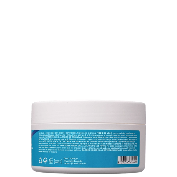 Lowell Extrato de Mirtilo Alto Impacto Máscara Capilar Lowell Extrato de Mirtilo foi desenvolvida para auxiliar na hidratação e regeneração completa do cabelo, sem deixar o aspecto pesado. Sua fórmula devolve a maciez e ainda forma um escudo de proteção contra a perda de proteínas. Conselho de Aplicação Nossos Experts Ensinam