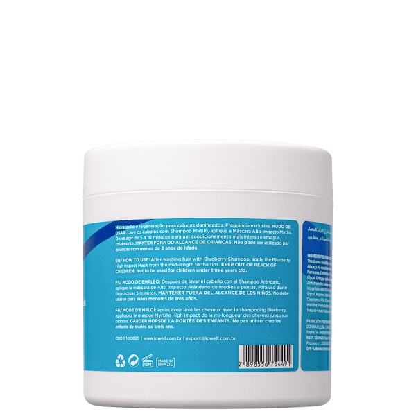 Máscara Capilar para todos os tipos de cabelo. Lowell Extrato de Mirtilo Alto Impacto Capilar promove um tratamento que resgata a aparência saudável do fio e garante brilho intenso.