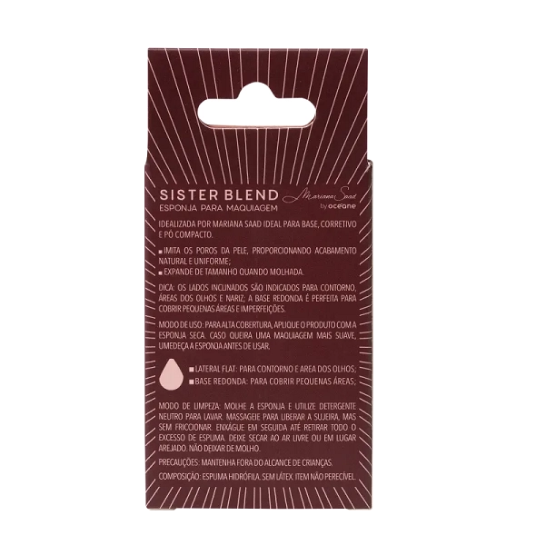 Esponja para maquiagem. Mariana Saad Sister Blend apresenta design moderno, que facilita a aplicação de produtos com texturas diversas, tanto em pó quanto cremosos. A Esponja de Maquiagem Mari Saad Sister Blend traz pontas que ajudam na cobertura de áreas menores do rosto, como olhos e nariz, e base redonda para uma maior camuflagem de imperfeições. Seu material, espuma hidrófila, sem látex, tem textura porosa igual a da pele, que garante um acabamento natural e uniforme para a make. Conselho de Aplicação A esponja pode ser usada úmida ou seca. Use as laterais arredondadas para aplicar a base ou o corretivo em áreas maiores, com movimento de leves batidinhas sobre a pele. Com a ponta mais fina, faça correções pontuais de imperfeições, manchas ou acne. Use a parte plana da esponja para espalhar o produto nas abas do nariz ou ao redor dos olhos. Quando molhada, a esponja expande de tamanho e proporciona um acabamento ainda mais suave do produto aplicado.Mariana Saad by Océane Sister Blend - Esponja para Maquiagem