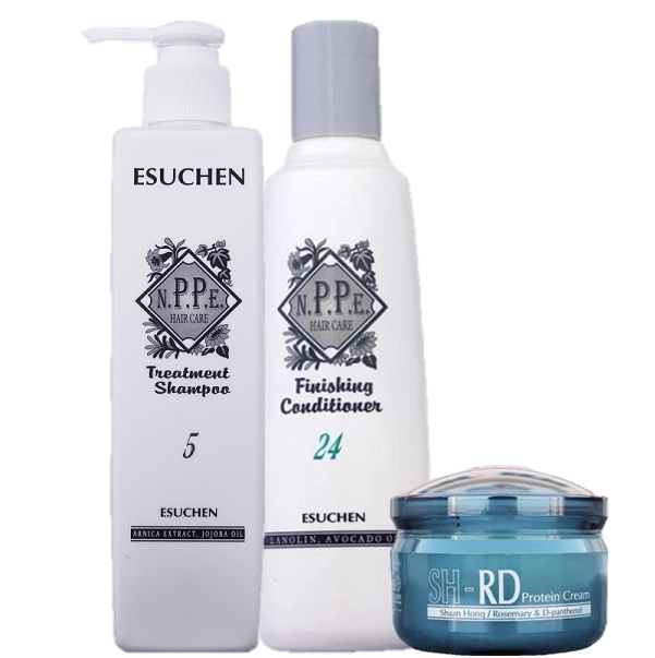 NPPE Herbal N 5 Treatment Shampoo N 24 Condicionador 250ml e Protein Cream 50ml Shampoo de tratamento para cabelos danificados. Sua fórmula hidrata e protege os cabelos do ressecamento causado por agentes externos como vento, frio e poluição. O cuidado ideal para cabelos secos, com fadiga elástica e desbotados,resultados de tratamentos químicos repetitivos. Seus ingredientes trazem de volta a nutrição e umidade natural que seus cabelos precisam. Conselho de Aplicação Aplique o shampoo nos cabelos molhados. Massageie com delicadeza e enxague bem. Repita a aplicação. Condicionador para todos os tipos de cabelos. Sua exclusiva fórmula catiônica ativa previne o embaraçamento dos fios e neutraliza a eletricidade estática. Seu fator ácido fraco, adstringe a cutícula capilar e previne pontas secas, duplas e ásperas. Preserva a umidade natural dos cabelos com suavidade promovendo maciez absoluta. A manutenção ideal que seus cabelos precisam! Conselho de Aplicação Distribua o condicionador igualmente nos cabelos. Massageie delicadamente por todo o cabelo até as pontas. Deixe por alguns minutos. Enxágue bem. Complemente seu tratamento com o NPPE Herbal Nº2 Oily Fine Hair Shampoo N.P.P.E. SH-RD Nutra-Therapy Protein Conselho de Aplicação