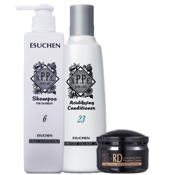 N.P.P.E. Herbal Nº 6 Dandruff Shampoo anticaspa para o couro cabeludo oleoso. Tratamento especial para combater a descamação e coceira associadas à caspa. Sua fórmula poderosa contém agentes naturais e minerais que produzem um efeito refrescante e tranquilizador, amenizando as reações do couro cabeludo às mudanças climáticas. Favorece o desaparecimento dos sintomas para manter a saúde do couro cabeludo. Aplique o shampoo nos cabelos molhados. Massageie delicadamente e aguarde 1 minuto. Enxague bem. Repita a aplicação. Use o shampoo diariamente para melhores resultados, até o desaparecimento dos sintomas ou até quando for necessário para manter a saúde do couro cabeludo. Aconselha-se a aplicação com outro shampoo para evitar a resistência aos medicamentos. N.P.P.E. Herbal Nº 23 Acidifying Condicionador para os cabelos secos, danificados e quimicamente tratados. Sua fórmula ácido balanceada restaura o pH natural de seus cabelos e recupera os danos causados por tratamentos químicos. Seus agentes formam uma camada protetora nos fios, promovendo fortalecimento e diminuindo o frizz. Age fechando a cutícula dos cabelos e devolve a umidade natural os fios. A restauração que seu cabelo precisa!. Distribua o condicionador igualmente nos cabelos. Massageie delicadamente por todo o cabelo até as pontas. Deixe por alguns minutos. Enxague bem. Mantenha a embalagem bem fechada Complemente seu tratamento com NPPE Herbal Nº5 Treatment Shampoo. N.P.P.E. SH-RD Nutra-Therapy Protein Creme leave-in restaurador diário para cabelos porosos e com pontas duplas. N.P.P.E. SH-RD Nutra-Therapy Protein recupera dos danos e hidrata. Conselho de AplicaçãoNPPE Herbal N 6 Shampoo Dandruff N 23 Condicionador 250ml e Protein Cream Gold 80ml