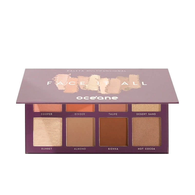 Océane Face it All é perfeita para proporcionar um look poderoso e moderno. Multifuncional, a paleta conta com 8 tons versáteis, ideais para serem utilizados como blush, iluminador, sombra, bronzer e contorno. Compacta e com espelho acoplado, você poderá levá-la na bolsa para criar uma make completa em qualquer lugar. Conselho de AplicaçãoOcéane Purple Face it All - Paleta Multifuncional 25,6g