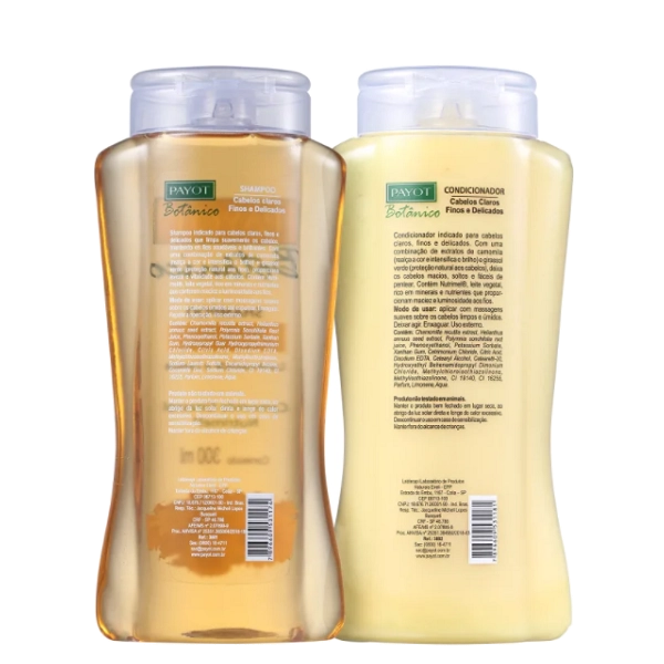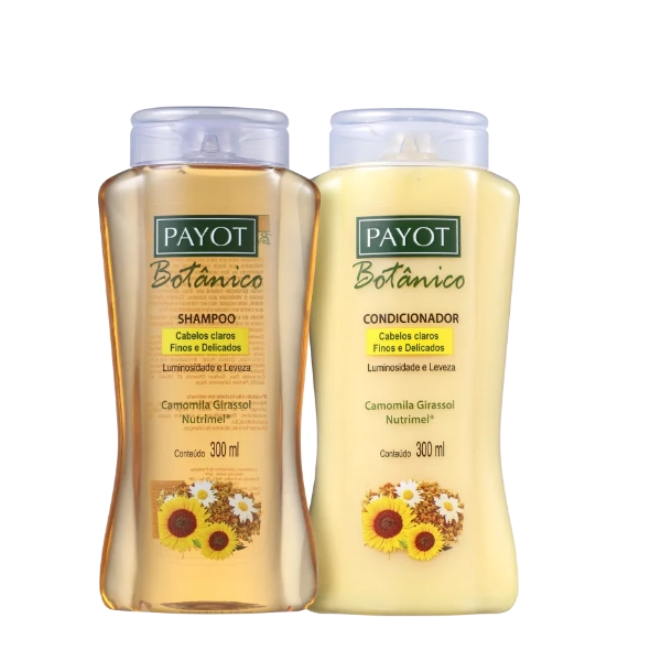 Kit para cabelos claros, finos e delicados. Kit Payot Botânico Camomila, Girassol e Nutrimel Duo ilumina os fios enquanto promove leveza e maciez diária. Kit Payot Botânico Camomila, Girassol e Nutrimel Duo aumenta o brilho dos fios e realça os tons claros para que fiquem muito mais radiantes e com aspecto saudável. Facilita o pentear e deixa os fios soltos, com movimento bonito. Contém Payot Botânico Camomila, Girassol e Nutrimel - Shampoo 300ml: traz luminosidade e leveza enquanto limpa suavemente, sem agredir os fios. Payot Botânico Camomila, Girassol e Nutrimel - Condicionador 300ml: ilumina e proporciona desembaraço, maciez e leveza ao visual. Conselho de Aplicação Aplique o shampoo com massagens suaves sobre os cabelos úmidos até espumar. Enxague. Repita o procedimento, se sentir necessidade. Espalhe o condicionador no comprimento e pontas dos fios e massageie suavemente. Enxague.Payot Botânico Camomila, Girassol e Nutrimel Shampoo+Condicionador 300ml