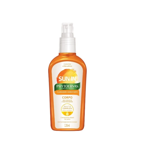 O Sun In da Phytoervas é um clareador que permite descolorir os pelos do corpo. Ao expor a pele com o produto aplicado ao sol ou calor do secador, conseguimos uma tonalidade mais clara. O efeito é gradual, permitindo assim um controle do tom desejado. O Sun In tem ação condicionadora, é enriquecido com extrato de camomila e óleo de Macadâmia que ajuda a proteger os fios enquanto clareia. Sua nova fórmula é mais potente e de fácil aplicação com spray.Phytoervas Sun In Clareador E Hidratante Corporal 120ml