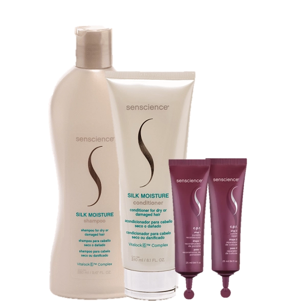 Senscience Silk Moisture Duo Home Care e CPR Tratamento Reconstrutor 2x25ml Senscience Silk Moisture Duo Home Care 2 produtos Kit de tratamento para cabelos secos e danificados. Senscience Silk Moisture Duo Kit limpa gentilmente, desembaraça e condiciona, hidratando e proporcionando maciez aos fios. Ação Conselho de Aplicação Aplique o shampoo no cabelo molhado e massageie até formar espuma. Depois, enxágue. Por fim, aplique o condicionador e deixe agir por alguns instantes. Enxágue. Resultado Cabelo limpo, hidratado, fortalecido e recuperado. Senscience C.P.R. - Tratamento Reconstrutor 2x25ml Para os cabelos severamente ressecados e danificados, C.P.R. é um tratamento intensivo restaurador que repara a porosidade das cutículas e supre as deficiências dos cabelos, devolvendo seus componentes vitais. Conselho de Aplicação 1- Lave os cabelos com o Shampoo Senscience Purifying, para remover as impurezas e o acúmulo de resíduos. Deixe agir a espuma por 5 minutos e enxague. 2- Retire o excesso de água dos fios delicadamente com uma toalha. 3- Aplique o passo 1 de C.P.R. na palma das mãos, esfregue e distribua pelos fios mecha por mecha. Penteie para distribuir o produto de maneira uniforme. 4- Deixe agir por 5 minutos com auxílio de touca térmica ou secador baixo/médio. NÃO ENXAGUE. 5- Aplique o passo 2 de C.P.R da mesma maneira, esfregando na palma das mãos e distribuindo mecha por mecha. Deixe agir por 10 minutos com uma das duas fontes de calor indicadas anteriormente. 6- Enxague completamente o produto com ÁGUA QUENTE. 7- Prossiga na secagem e modelagem dos fios como desejar. Dicas - Para melhores resultados é recomendado esperar pelo menos uma semana antes de usar o C.P.R. após um tratamento com química. Isso vai permitir que o permanente, relaxamento ou coloração se fixe completamente no cabelo antes de promover um tratamento intensivo especializado. - No caso de utilizar o passo 2 em excesso nos fios, estes poderão ficar pesados ou um pouco oleosos. Caso isto ocorra, utilize o Silk Moisture Conditioner. - Condicionador após o tratamento. Ele irá retirar a oleosidade excessiva. - Recomenda-se a utilização do Condicionador Senscience Inner Restore e a Máscara Inner Restore Intensif para a manuteção do tratamento. Resultado C.P.R. Fortalece, hidrata e protege os cabelos. Cabelos sadio e protegido, pontas duplas seladas, prevenção de quebra, cabelo reconstruido, macio, sedoso e com muito brilho.