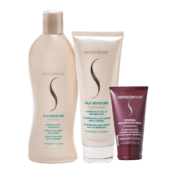 Senscience Silk Moisture Duo Home Care e Renewal Mask 150ml Shampoo Senscience Silk Moisture Shampoo para cabelos secos ou danificados. O Sensciense Silk Moisture limpa, hidrata e restaura os fios que sofreram os mais variados danos, tanto por ferramentas térmicas, processos químicos ou fatores ambientais. De fórmula rica em nutrientes, o Shampoo Senscience Silk Moisture tem o poder de penetrar no cabelo para recuperar a saúde desde o interior, hidratando e fortalecendo. Dessa forma, seus fios ficam limpos, saudáveis, com brilho e maciez. Conselho de Aplicação Aplique o shampoo nos cabelos úmidos e massageie delicadamente com as pontas dos dedos. Após a formação de espuma, enxágue até a remoção de todo o produto. Caso seja necessário, repita o processo. Nossos Experts Ensinam Para melhores resultados, use a linha completa Silk Moisture, de Senscience. Senscicence Silk Moisture ConditionerCondicionador de litro para cabelos secos ou danificados. Senscience Silk Moisture Conditioner desembaraça e condiciona os fios. Ele também proporciona a hidratação ideal e reparação da fibra capilar. Senscience Renewal Reconstructive Mask A Máscara Reconstrutora Senscience Renewal Reconstructive Mask faz parte de um sistema para o cuidado capilar que atua em sinergia reparando e restaurando cabelos danificados, quebradiços ou com pontas duplas. É formulada com ativos e óleos naturais, que dão um novo enfoque aos produtos visando direcioná-los para a manutenção dos fios em casa, com resultados de salão. Quando for finalizar o cabelo, aplique um produto finalizador do tipo leave-in para proteger os fios do uso de secador ou chapinha e aí sim, escove e modele com desejar.