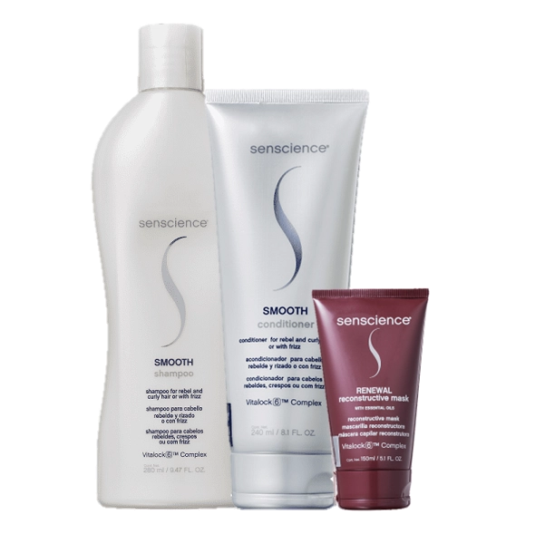 Senscience Smooth Home Care Duo e Renewal Mask 150ml Shampoo Senscience Smooth Shampoo para cabelos rebeldes e com frizz. Senscience Smooth limpa, proporciona maciez e controla os fios arrepiados. Graças à sua fórmula rica e tecnológica, o shampoo ajuda a deixar o cabelo grosso e resistente, tonando mais fácil de domar. O Shampoo Senscience Smooth é responsável, também, por proporcionar maciez a esse tipo de fio e, assim, você deixa a presilha de lado e vence a batalha contra o frizz! Conselho de Aplicação Para melhores resultados, use a linha completa Smooth, de Senscience. Condicionador Senscience Smooth Condicionador para cabelos rebeldes e com frizz. Senscience Smooth facilita o desembaraçar e proporciona disciplina e controle aos fios. Usando o Condicionador Senscience Smooth , seus fios são alinhados, domados, recuperados e restaurados, ficando saudáveis e com uma textura mais macia e sedosa. Além disso, ganham força e nutrição. Conselho de Aplicação Para melhores resultados, use a linha completa Smooth, de Senscience. Senscience Renewal Reconstructive Mask A Máscara Reconstrutora Senscience Renewal Reconstructive Mask faz parte de um sistema para o cuidado capilar que atua em sinergia reparando e restaurando cabelos danificados, quebradiços ou com pontas duplas. É formulada com ativos e óleos naturais, que dão um novo enfoque aos produtos visando direcioná-los para a manutenção dos fios em casa, com resultados de salão. Quando for finalizar o cabelo, aplique um produto finalizador do tipo leave-in para proteger os fios do uso de secador ou chapinha e aí sim, escove e modele com desejar.