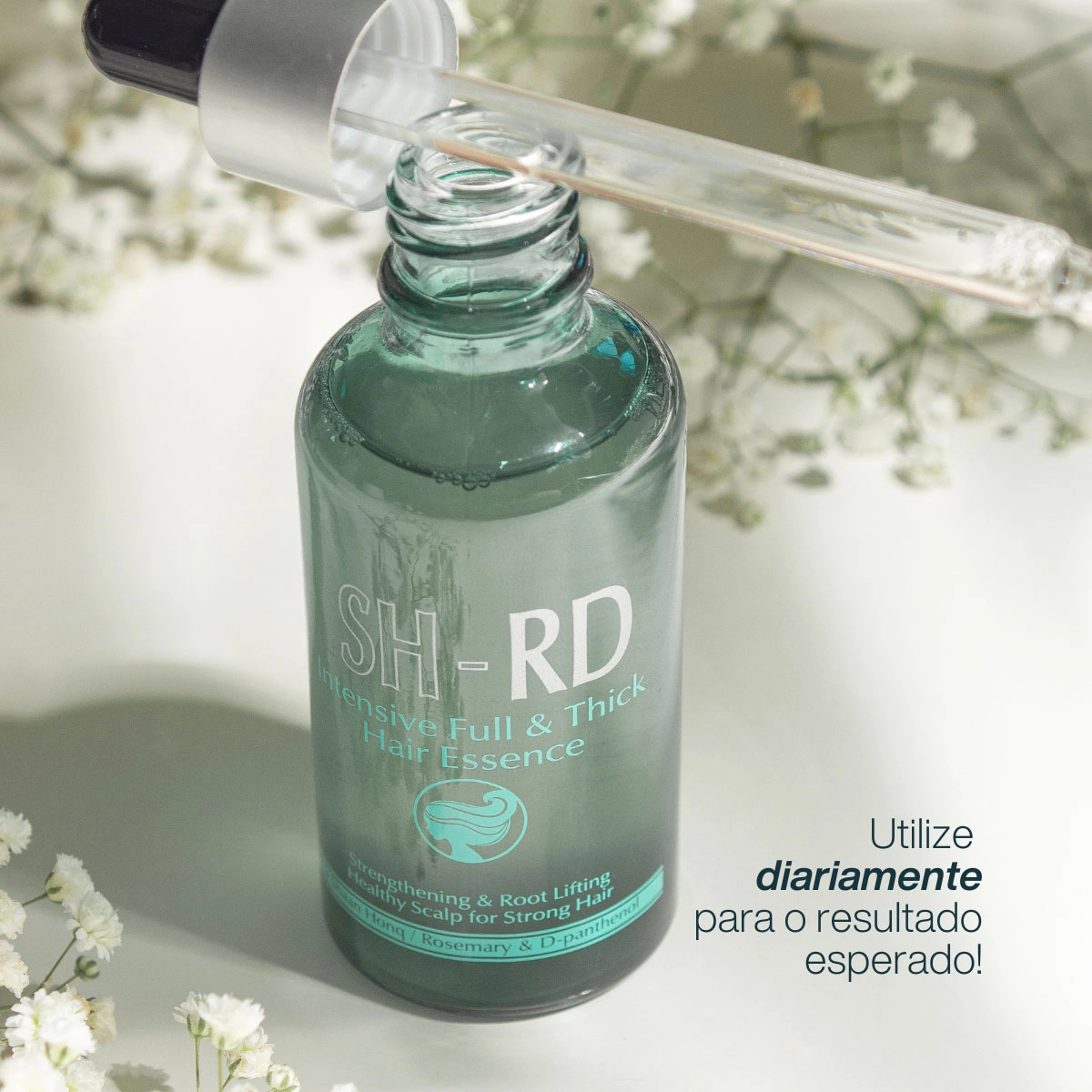 Para cabelos quebradiços e com queda. Com ativos poderosos, que estimulam o crescimento e fortalecem os fios. Sua fórmula leve fortalece o bulbo capilar, aumentando a resistência da haste. De textura leve e não oleosa, é de rápida absorção. Seu uso contínuo promove fios saudáveis, aumentando a densidade e o volume do cabelo. Conselho de Aplicação Aplique diretamente no couro cabeludo, podendo ser com os cabelos molhados ou secos. Massageie suavemente para ativar a circulação e facilitar a absorção.SH-RD Intensive Full & Thick Essence - Tônico Antiqueda Fortificante 50ml