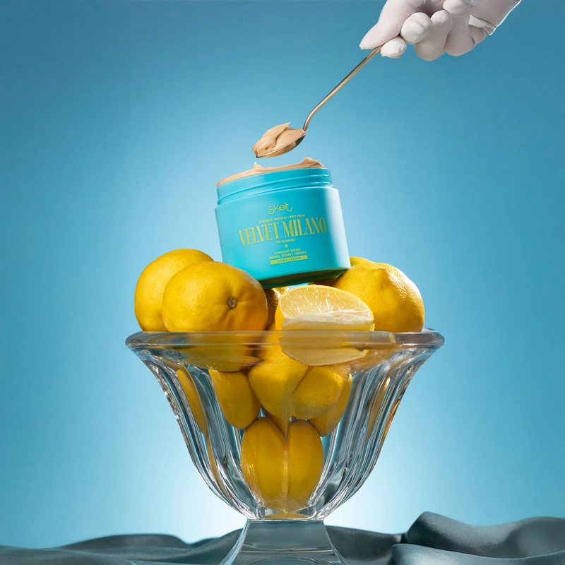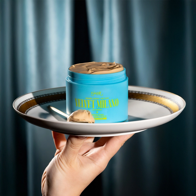 Une nutrição intensa, brilho radiante e fragrância marcante. Rico em ceramidas e glicerina, fortalece a barreira da pele, hidrata profundamente, garante toque macio e luminoso. Sua textura cremosa de rápida absorção entrega um glow elegante com micropartículas iluminadoras e uma fragrância gourmand envolvente que transforma o autocuidado em celebração. Conselho de Aplicação Skelt Velvet Milano - Hidratação Intensa, Glow e Perfume Sofisticado