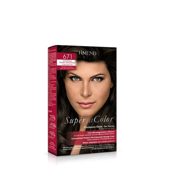 <div class="container-padding product-description accordion-pdp-padding accordion-pdp-item" style="-webkit-font-smoothing: antialiased; box-sizing: inherit; margin: 0px; padding: 20px 0px 0px; color: #212121;"> <div class="accordion-pdp" style="-webkit-font-smoothing: antialiased; box-sizing: inherit; margin: 0px; padding: 0px;" title="pressione TAB para descobrir mais sobre"> <div id="description-region" class="accordion-is-hidden" style="-webkit-font-smoothing: antialiased; box-sizing: inherit; margin: 0px; padding: 0px;"> <p class="product-description-name" style="-webkit-font-smoothing: antialiased; box-sizing: inherit; margin: 0px; padding: 0px 0px 15px; font-size: 1rem; font-weight: bold; line-height: 1.5rem;"><span style="color: #808080;"><span style="font-size: 14px;"><span style="font-family: arial,helvetica,sans-serif;">Amend Supéria Color 671 Louro Escuro Marrom Acinzentado</span></span></span></p> <div class="product-description-content reset-allow-bold" style="-webkit-font-smoothing: antialiased; box-sizing: inherit; margin: 0px; padding: 0px 0px 15px; color: #777777; line-height: 1.6;"> <p style="-webkit-font-smoothing: antialiased; box-sizing: inherit; margin: 0px; padding: 0px;"><span style="color: #808080;"><span style="font-size: 14px;"><span style="font-family: arial,helvetica,sans-serif;">Creme tonalizante sem amônica. <span style="-webkit-font-smoothing: antialiased; box-sizing: inherit; margin: 0px; padding: 0px; font-weight: 700 !important;">Amend Supéria Color </span>colore os fios com tom vibrante, cheio de brilho e cobre fios brancos em até 50%. Em diversas cores modernas e que seguem as tendências, cria reflexos com aspecto muito natural.</span></span></span></p> <p style="-webkit-font-smoothing: antialiased; box-sizing: inherit; margin: 0px; padding: 0px;"> </p> <p style="-webkit-font-smoothing: antialiased; box-sizing: inherit; margin: 0px; padding: 0px;"><span style="color: #808080;"><span style="font-size: 14px;"><span style="font-family: arial,helvetica,sans-serif;">O <span style="-webkit-font-smoothing: antialiased; box-sizing: inherit; margin: 0px; padding: 0px; font-weight: 700 !important;">Tonalizante Supéria Color, de Amend</span>, possui fórmula em creme que não agride nem resseca durante a coloração e promove tom duradouro. Seus micropigmentos penetram no fio enquanto silicones selam as cutículas para fixar a cor por mais tempo e proporcionar brilho intenso. Ainda oferece tratamento nutritivo que revela um cabelo macio e cheio de vida.</span></span></span></p> <p style="-webkit-font-smoothing: antialiased; box-sizing: inherit; margin: 0px; padding: 0px;"> </p> <p style="-webkit-font-smoothing: antialiased; box-sizing: inherit; margin: 0px; padding: 0px;"><span style="color: #808080;"><span style="font-size: 14px;"><span style="font-family: arial,helvetica,sans-serif;"><span style="-webkit-font-smoothing: antialiased; box-sizing: inherit; margin: 0px; padding: 0px; font-weight: 700 !important;">Contém</span></span></span></span></p> <p style="-webkit-font-smoothing: antialiased; box-sizing: inherit; margin: 0px; padding: 0px;"> </p> <p style="-webkit-font-smoothing: antialiased; box-sizing: inherit; margin: 0px; padding: 0px;"><span style="color: #808080;"><span style="font-size: 14px;"><span style="font-family: arial,helvetica,sans-serif;"><span style="-webkit-font-smoothing: antialiased; box-sizing: inherit; margin: 0px; padding: 0px; font-weight: 700 !important;">Amend Supéria Color - Tonalizante 40g:</span> bisgana com coloração em creme. Cria reflexos com aspecto natural e muito brilho.</span></span></span></p> <p style="-webkit-font-smoothing: antialiased; box-sizing: inherit; margin: 0px; padding: 0px;"> </p> <p style="-webkit-font-smoothing: antialiased; box-sizing: inherit; margin: 0px; padding: 0px;"><span style="color: #808080;"><span style="font-size: 14px;"><span style="font-family: arial,helvetica,sans-serif;"><span style="-webkit-font-smoothing: antialiased; box-sizing: inherit; margin: 0px; padding: 0px; font-weight: 700 !important;">Amend - Emulsão Reveladora 60ml:</span> revela os pigmentos da coloração de maneira uniforme e fiel à cartela de cores.</span></span></span></p> <p style="-webkit-font-smoothing: antialiased; box-sizing: inherit; margin: 0px; padding: 0px;"> </p> <p style="-webkit-font-smoothing: antialiased; box-sizing: inherit; margin: 0px; padding: 0px;"><span style="color: #808080;"><span style="font-size: 14px;"><span style="font-family: arial,helvetica,sans-serif;"><span style="-webkit-font-smoothing: antialiased; box-sizing: inherit; margin: 0px; padding: 0px; font-weight: 700 !important;">Amend Pós-Coloração Synergy Color - Tratamento 2x15g: </span>sachês de tratamento que protegem ainda mais os fios durante a coloração, prolongam o efeito e nutrem os fios para que eles fiquem sedosos e muito brilhantes.</span></span></span></p> <p style="-webkit-font-smoothing: antialiased; box-sizing: inherit; margin: 0px; padding: 0px;"> </p> <p style="-webkit-font-smoothing: antialiased; box-sizing: inherit; margin: 0px; padding: 0px;"><span style="color: #808080;"><span style="font-size: 14px;"><span style="font-family: arial,helvetica,sans-serif;">Folheto explicativo e par de luvas descartáveis.</span></span></span></p> </div> </div> </div> </div> <div class="container-padding product-characteristics accordion-pdp-item" style="-webkit-font-smoothing: antialiased; box-sizing: inherit; margin: 0px; padding: 0px; color: #212121;"> <div class="accordion-pdp" style="-webkit-font-smoothing: antialiased; box-sizing: inherit; margin: 0px; padding: 0px;" title="pressione ENTER e TAB para saber como usar o produto"> <div id="characteristics-region" class="accordion-is-hidden" style="-webkit-font-smoothing: antialiased; box-sizing: inherit; margin: 0px; padding: 0px;"> <div class="product-characteristics-content reset-allow-bold" style="-webkit-font-smoothing: antialiased; box-sizing: inherit; margin: 0px; pad