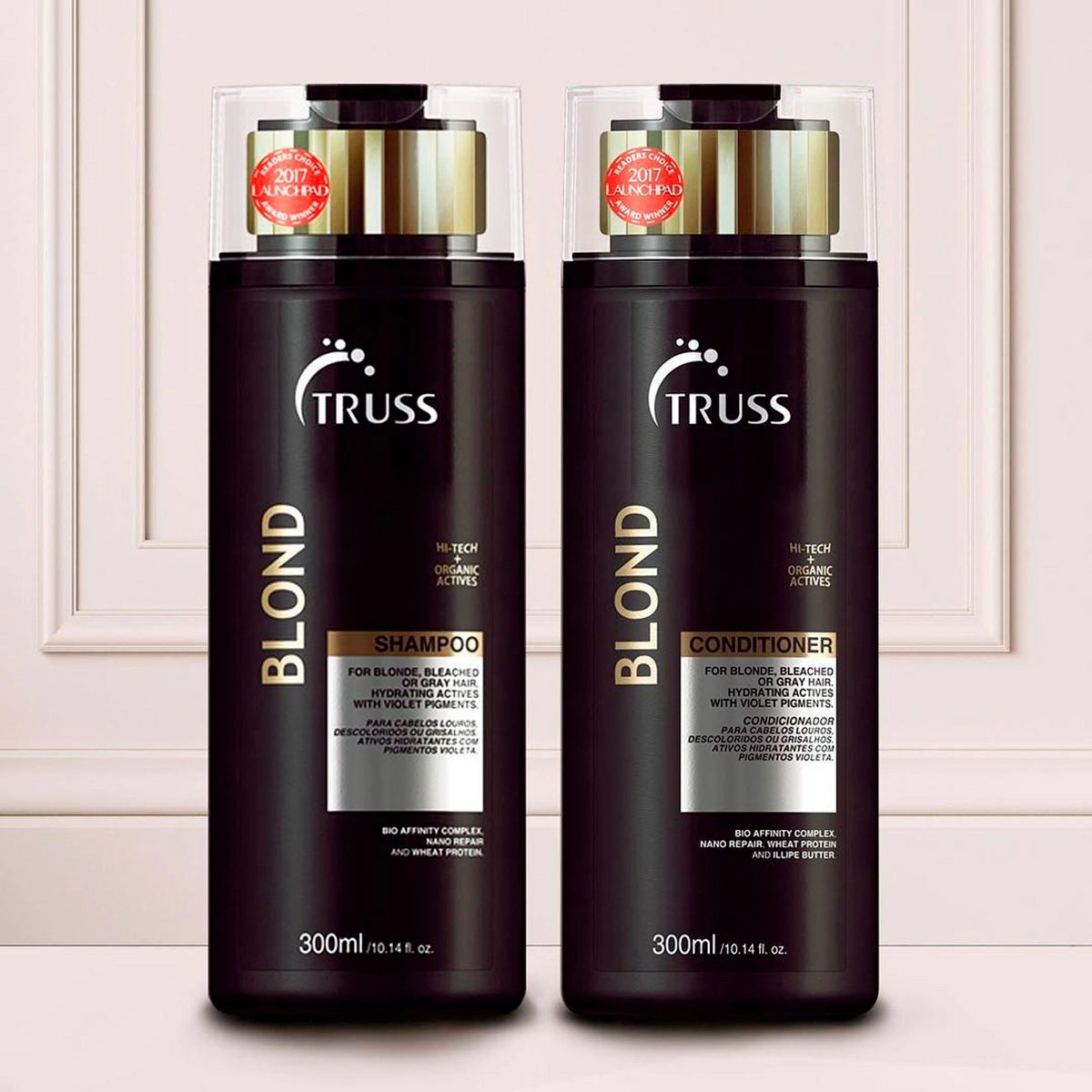 Kit para cabelos loiro com tecnologia que recuperam a elasticidade dos fio, devolve o brilho, maciez e a maleabilidade. Com vitaminas, proteínas e óleos que reestruturam a fibra capilar com o resgate da força e a elasticidade do córtex. Este Kit Contém: O Shampoo Truss Blond 300ml: é formulado com tecnologias que recuperam a elasticidade dos fios, protegendo contra as agressões externas. Truss Blond possui pigmentos violetas que resgatam o brilho platinado e eliminam o aspecto amarelado de forma progressiva. Truss Blond Conditioner 300ml: contém pigmentos violetas que eliminam o amarelamento da oxidação dos fios, causado pela exposição ao sol, uso de ferramentas de calor e demais agressões. Além disso, possui tecnologia que trata os fios de dentro para fora. Ela aumenta elasticidade e sela as cutículas, o que confere maior resistência contra a quebra, além de luminosidade constante e maciez que dura o dia inteiro. O Tratamento Condicionante Truss Frizz Zero 260ml: é ultraconcentrado e de fácil absorção, foi desenvolvido para condicionar, hidratar, selar a cutícula capilar e devolver rapidamente a maciez, o brilho e a maleabilidade aos fios. Possui efeito instantâneo e ação antifrizz, pode ser usado antes, durante ou depois dos seus cuidados com os cabelos. O Tratamento Reconstrutor Truss Uso Obrigatório 260ml: age com a reconstrução das partes do fio fragilizadas, a fim de restaurar a força e a resistência. A fórmula ainda conta com antioxidantes, que protegem dos danos causados por radicais livres ao mesmo tempo em que recupera os fios tingidos contra o desbotamento. Truss Uso Obrigatório recupera o aspecto saudável do cabelo quimicamente tratado, enquanto disciplina os fios, protege do calor do secador e evita a formação de pontas duplas. Truss Specific Mask 180g: é um tratamento elaborado com vitaminas, proteínas e óleos que reestruturam a fibra capilar com o resgate da força e a elasticidade do córtex. Ele confere disciplina e emoliência aos fios para que eles fiquem maleáveis, com brilho e macios novamente. Conselho de aplicaçãoTruss Blond Specific Obrigatório Frizz Zero (5 produtos)