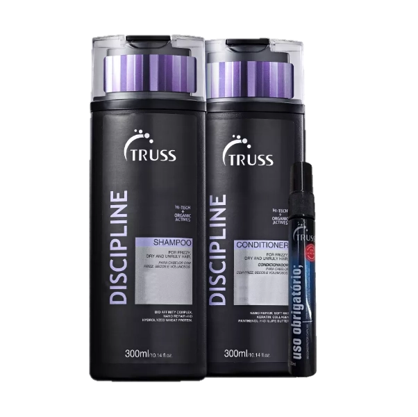 Truss Discipline - Shampoo+Condicionador 300ml Truss Uso Obrigatório Tratamento Reconstrutor 30ml O Tratamento Reconstrutor Truss Uso Obrigatório age com a reconstrução das partes do fio fragilizadas, a fim de restaurar a força e a resistência. A fórmula ainda conta com antioxidantes, que protegem dos danos causados por radicais livres ao mesmo tempo em que recupera os fios tingidos contra o desbotamento. Truss Uso Obrigatório recupera o aspecto saudável do cabelo quimicamente tratado, enquanto disciplina os fios, protege do calor do secador e evita a formação de pontas duplas. Conselho de Aplicação Dúvidas de como usar o seu Truss Uso Obrigatório? Ele pode ser plicado como tratamento ou leave-in. Para o primeiro resultado, após lavar o cabelo com shampoo, aplique o reconstrutor e, sem enxaguar, siga para o uso do condicionador. Para o segundo, aplique sobre o cabelo limpo e úmido. Finalize como desejar.Truss Discipline Duo 300ml e Mini Uso Obrigatorio 30ml