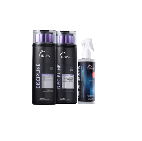 Tratamento com shampoo e condicionador para cabelos com frizz, secos e volumosos. Extremamente hidratante, Truss Discipline Duo confere efeito disciplinante enquanto dá brilho e reduz as pontas duplas. Truss Uso Obrigatório Reconstrutor para cabelos danificados. Truss Uso Obrigatório recupera o aspecto saudável enquanto disciplina e protege do calor. O Tratamento Reconstrutor Truss Uso Obrigatório age com a reconstrução das partes do fio fragilizadas, a fim de restaurar a força e a resistência. A fórmula ainda conta com antioxidantes, que protegem dos danos causados por radicais livres ao mesmo tempo em que recupera os fios tingidos contra o desbotamento. Truss Uso Obrigatório recupera o aspecto saudável do cabelo quimicamente tratado, enquanto disciplina os fios, protege do calor do secador e evita a formação de pontas duplas.Truss Discipline Shampoo+Condicionador 300ml+Uso Obrigatório 260ml