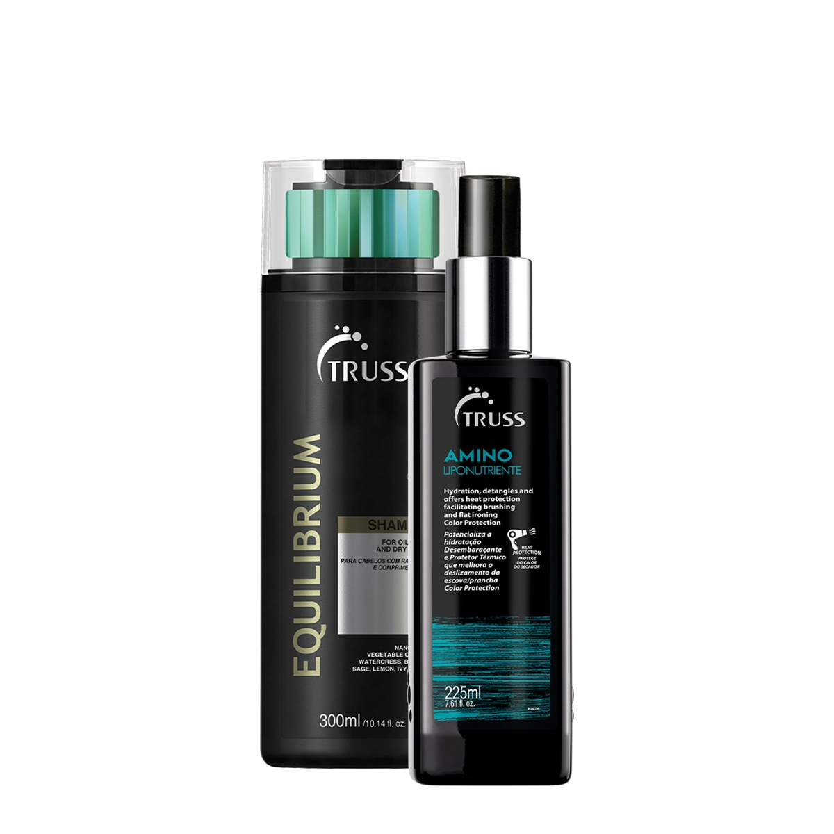 Esse Kit Contém Truss Equilibrium Shampoo 300ml: indicado para cabelos mistos a oleosos. atua no couro cabeludo para regular o excesso de oleosidade da raiz. previne o ressecamento e o enfraquecimento prematuro das pontas ao equilibrar a umidade natural dos fios. Com ele, você se livra da oleosidade excessiva enquanto mantém as pontas saudáveis e bonitas. Truss Amino Lipotronic - Protetor Térmico 225ml: protetor térmico para todos os tipos de cabelo. Truss Amino diminui o tempo de secagem dos fios e evita os danos causados pelo calor do secador e da prancha. sela os fios, o que proporciona maciez, controle, brilho e facilidade ao pentear e ao deslizar os acessórios térmicos. Conselho de Aplicação Truss Equilibrium Shampoo e Amino Lipotropic (2 produtos)
