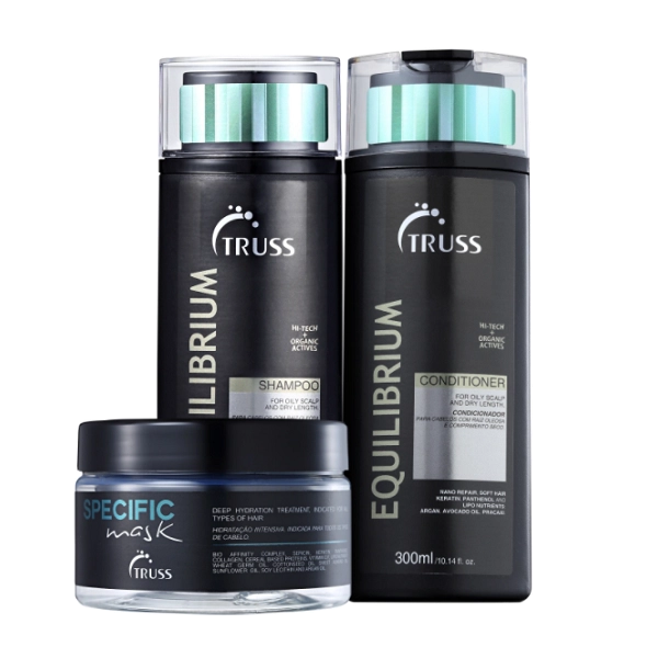 O Kit Truss Equilibrium Specific oferece um cuidado que regula a oleosidade, hidrata e repara dos fios dos cabelos oleosos ou mistos. O Kit Truss Equilibrium Specific previne o ressecamento e o enfraquecimento prematuro das pontas ao equilibrar a umidade natural dos fios. Também reestrutura a fibra capilar com o resgate da força e a elasticidade do córtex e confere disciplina aos fios, que ficam maleáveis, com brilho e macios novamente. Contém Truss Equilibrium Shampoo - 300ml: limpa o couro cabeludo enquanto regula a oleosidade da raiz. Truss Equilibrium Condicionador - 300ml: desembaraça sem pensar os fios enquanto previne o excesso de oleosidade. Truss Specific - Máscara Capilar 180g: repara os fios de forma intensa enquanto repõe a hidratação. Conselho de Aplicação Aplique o shampoo nos cabelos úmidos massageando suavemente. Depois enxague abundantemente. Se preferir uma limpeza mais profunda repita todo o processo. Em seguida, distribua a máscara no comprimento e pontas dos fios. Massageie as mechas e deixe agir por 5 minutos. Enxágue bem. Use de 1 a 3 vezes por semana. Passe o condicionador pelo comprimento dos fios. Deixe agir por alguns minutos e depois enxague abundantemente.Truss Equilibrium - Shampoo+Condicionador 300ml+Mascara Specific 180g