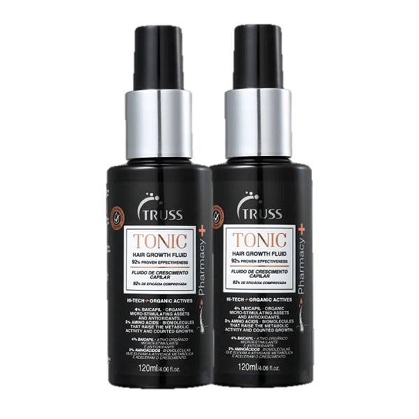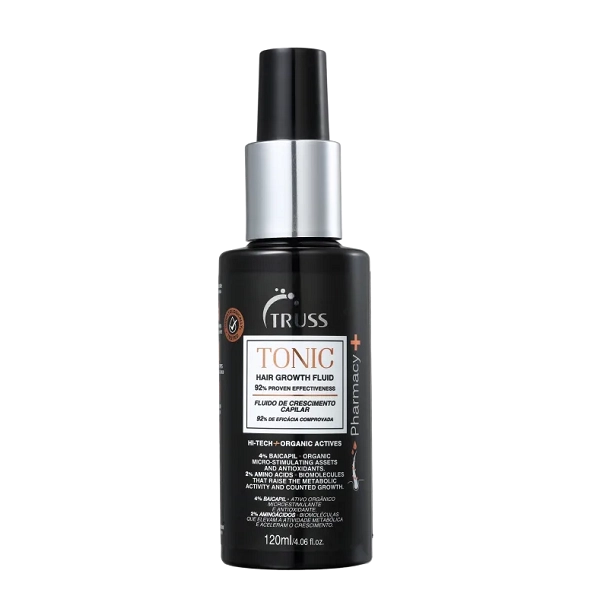 Tônico para cabelos com quedas e ralos. Truss Hair Growth Fluid Pharmacy+ estimula a circulação sanguínea e fortalece os fios. Tônico Capilar Truss Hair Growth Pharmacy+ é ideal para revitalizar o folículo capilar, regenerar o couro cabeludo e auxiliar na redução da oleosidade. Perfeito para quem deseja cabelos compridos e resistentes. Ação Baicapil: ativo inovador orgânico que age na raiz do fio, é responsável por ativar as células-tronco que os originam, favorecendo a respiração celular, estimulando o crescimento e aumento de volume dos fios e a diminuição da queda. Protege dos danos do stress oxidativo e possui ação Anti-Aging. Aminoácidos: conjunto de biomoléculas que eleva a atividade metabólica e acelera o crescimento capilar. Conselho de Aplicação Agite antes de usar. Aplique no couro cabeludo, uma vez por dia, massageando suavemente com a ponta dos dedos para espalhar o produto uniformemente. Não enxágue. É fundamental massagear o couro cabeludo ao aplicar o produto, pois isto irá ativar a circulação sanguínea, o que promoverá melhor oxigenação das raízes e melhorará a absorção dos nutrientes. Resultado Seu cabelo mais resistente. Truss Hair Growth Fluid Pharmacy+ - Tônico Capilar 120ml