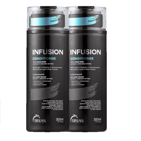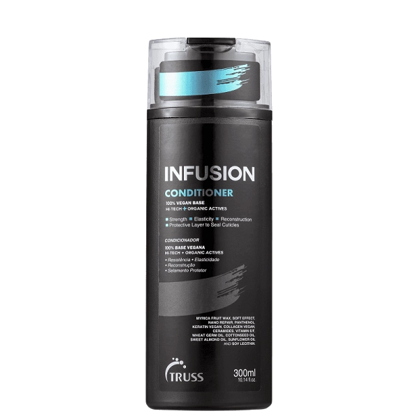 Truss Infusion Condicionador para cabelos secos, opacos e quebradiços. Truss Infusion Conditioner reconstrói, hidrata, fortalece e desembaraça os fios. A fórmula de Truss Infusion Conditioner sela as cutículas enquanto repara profundamente. Ela também proporciona brilho, maciez e elasticidade. Seu cabelo volta a ter vida e força no cuidado diário. Conselho de Aplicação Com os fios limpos, espalhe o condicionador sobre o comprimento e pontas. Deixe agir alguns minutos e, então, enxágue.