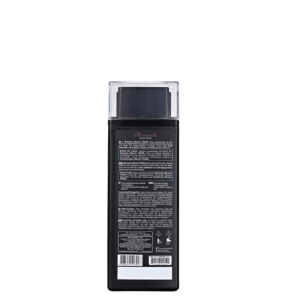 Shampoo para todos os tipos de cabelo. Limpa gentilmente enquanto recupera a elasticidade da fibra capilar, tornando-os mais resistentes à quebra. Com brilho intenso 3D, Truss Miracle Shampoo proporciona luminosidade inigualável para os fios. Conselho de Aplicação Passe o shampoo sobre os fios úmidos. Massageie até formar espuma e, então, enxágue.
