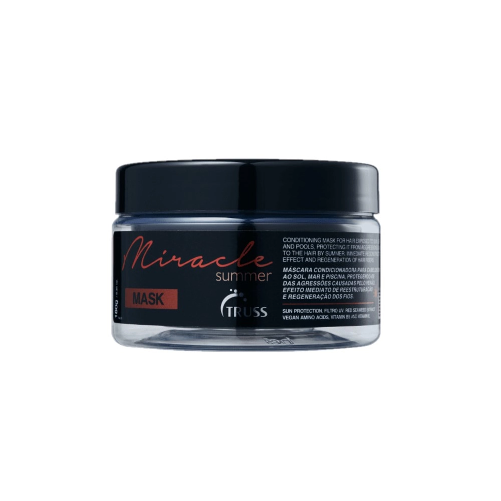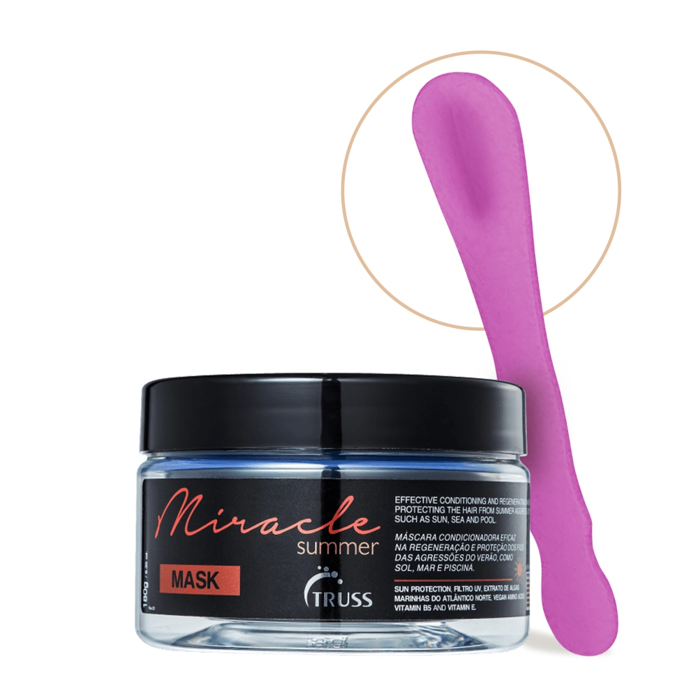 Máscara de reconstrução capilar. Truss Miracle Summer conta com ingredientes para proteção contra exposição ao sol, piscina e mar. A Máscara Capilar Truss Miracle Summer foi formulada especificamente para quem ama o verão e quer ter cabelos saudáveis durante o ano todo. Com ingredientes como Vitamina E, Aminoácidos e Extrato de Algas, dá resultado imediato de reestruturação e regeneração da fibra capilar, com tratamento preventivo e curativo. Conheça a linha completa para viver o verão intensamente! Acompanha Espátula Para Creme Conselho de Aplicação Após lavar o cabelo com o Shampoo, retire o excesso de água e aplique a máscara do comprimento às pontas. Deixe agir por 5 minutos e enxágue. Para um tratamento total, utilize a linha completa de produtos: o Shampoo Truss Miracle Summer e o Condicionador Truss Miracle Summer.Truss Miracle Summer Máscara Capilar Verão 180g