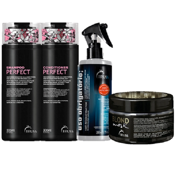 Truss Alexandre Herchcovitch Perfect Duo oferece um cuidado diário que repara os danos causados pelas agressões externas. Contém: Truss Perfect - Shampoo 300ml: limpa e auxilia na restauração das cutículas danificadas. Truss Perfect - Condicionador 300ml: desembaraça e devolve suavemente a elasticidade e resistência. Truss Blond Mask180g- condiciona e neutraliza tons alaranjados e amarelados. Truss Uso Obrigatório260ml- recupera o aspecto saudável enquanto disciplina e protege do calor. Aplique o shampoo no cabelo molhado, sobretudo na raiz, e massageie. Deixe agir por 2 minutos e enxágue. Repita o procedimento.Aplique a máscara após o shampoo, deixe agir por 5 minutos e enxágue bem. Indicada para uso de 1 a 3 vezes por semana.Passe o condicionador no cabelo úmido e massageie. Deixe agir por 2 minutos e enxágue. O Uso Obrigatorio pode ser plicado como tratamento ou leave-in. Para o primeiro resultado, após lavar o cabelo com shampoo, aplique o reconstrutor e, sem enxaguar, siga para o uso do condicionador. Para o segundo, aplique sobre o cabelo limpo e úmido. Finalize como desejar.Truss Perfect