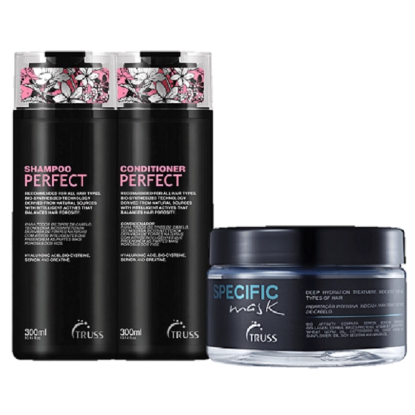 Truss Alexandre Herchcovitch Perfect Duo oferece um cuidado diário que repara os danos causados pelas agressões externas. Contém: Truss Perfect - Shampoo 300ml: limpa e auxilia na restauração das cutículas danificadas. Truss Perfect - Condicionador 300ml: desembaraça e devolve suavemente a elasticidade e resistência. Aplique o shampoo no cabelo molhado, sobretudo na raiz, e massageie. Deixe agir por 2 minutos e enxágue. Repita o procedimento. Passe o condicionador no cabelo úmido e massageie. Após lavar o cabelo com o Shampoo, retire o excesso de água e aplique a máscara do comprimento às pontas.Após lavar o cabelo, aplique a máscara Specific no comprimento e pontas dos fios. Massageie as mechas e deixe agir por 5 minutos. Enxágue bem. Use de 1 a 3 vezes por semana.Truss Perfect