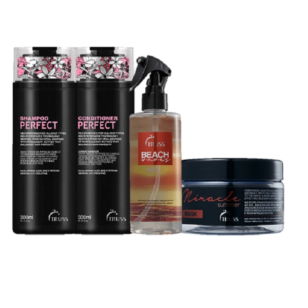 Truss Alexandre Herchcovitch Perfect Duo oferece um cuidado diário que repara os danos causados pelas agressões externas. Contém: Truss Perfect - Shampoo 300ml: limpa e auxilia na restauração das cutículas danificadas. Truss Perfect - Condicionador 300ml: desembaraça e devolve suavemente a elasticidade e resistência. Truss Miracle Summer 180g- conta com ingredientes para proteção contra exposição ao sol, piscina e mar. Truss Beach Waves 260ml- proporciona textura e finalização de “efeito praia” nos fios. Aplique o shampoo no cabelo molhado, sobretudo na raiz, e massageie. Deixe agir por 2 minutos e enxágue. Repita o procedimentoPasse o condicionador no cabelo úmido e massageie. Após lavar o cabelo com o Shampoo, retire o excesso de água e aplique a máscara do comprimento às pontas. Deixe agir por 5 minutos e enxágue. Agite antes de usar o Beach e, em seguida, aplique no cabelo seco. Para texturizar, amasse os fios, deixe secar naturalmente ou utilize uma fonte de calor. Truss Perfect