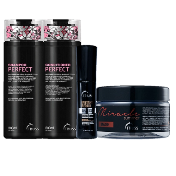Truss Alexandre Herchcovitch Perfect Duo oferece um cuidado diário que repara os danos causados pelas agressões externas. Contém: Truss Perfect - Shampoo 300ml: limpa e auxilia na restauração das cutículas danificadas. Truss Perfect - Condicionador 300ml: desembaraça e devolve suavemente a elasticidade e resistência. Truss Miracle Summer 180g- conta com ingredientes para proteção contra exposição ao sol, piscina e mar. Truss Instant Repair 45ml devolve o brilho, toque sedoso e ainda bloqueia a umidade. É ideal para usar a qualquer momento e dar um toque de vitalidade e saúde nos dios. Aplique o shampoo no cabelo molhado, sobretudo na raiz, e massageie. Deixe agir por 2 minutos e enxágue. Repita o procedimentoPasse o condicionador no cabelo úmido e massageie. Após lavar o cabelo com o Shampoo, retire o excesso de água e aplique a máscara do comprimento às pontas. Deixe agir por 5 minutos e enxágue.No cabelo seco ou úmido, aplique uma pequena quantidade do Instant e espalhe bem com a ponta dos dedos. Em seguida, deixe secar naturalmente ou seque com secador. Truss Perfect